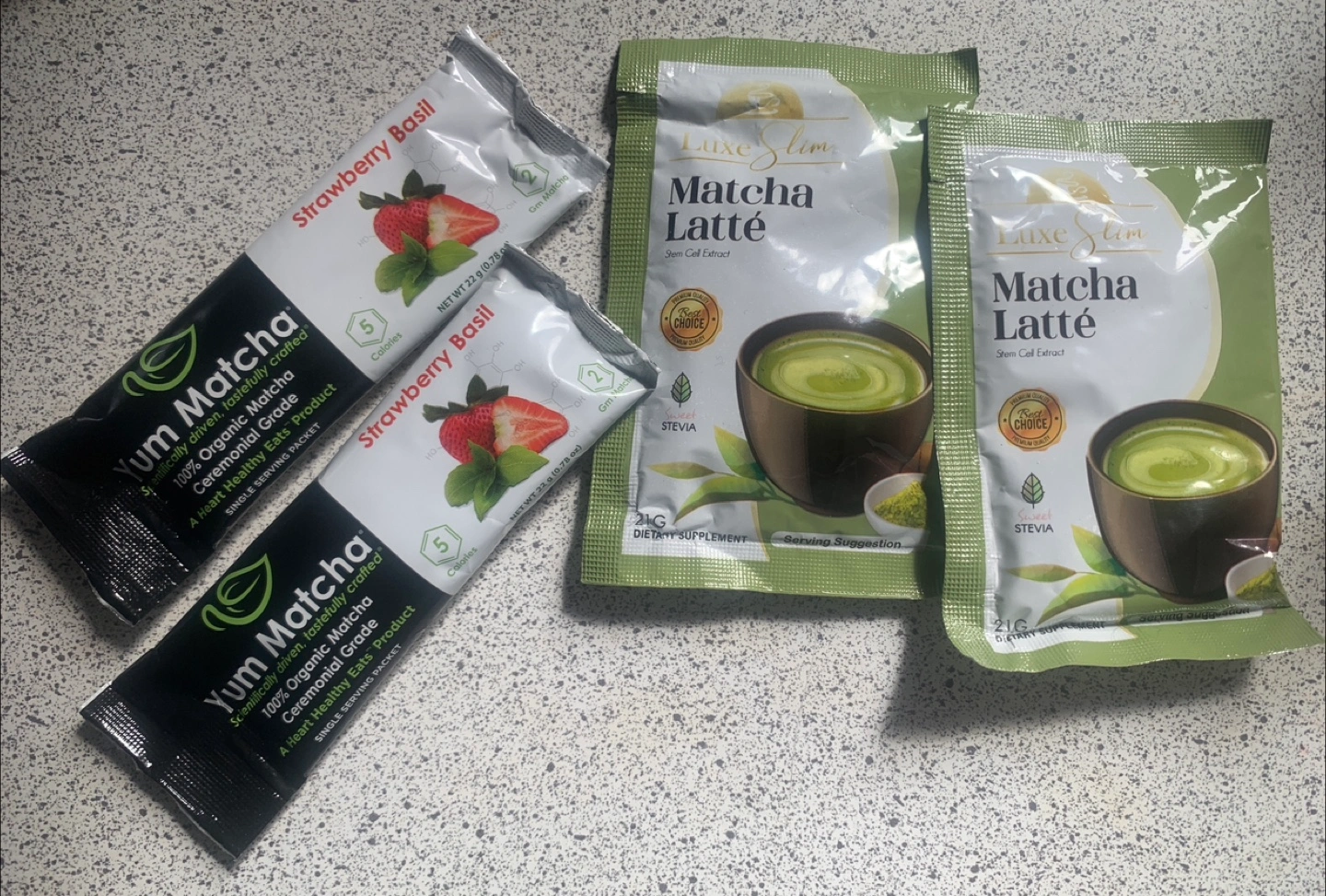 Yum Matcha Strawberry Basil sachets.