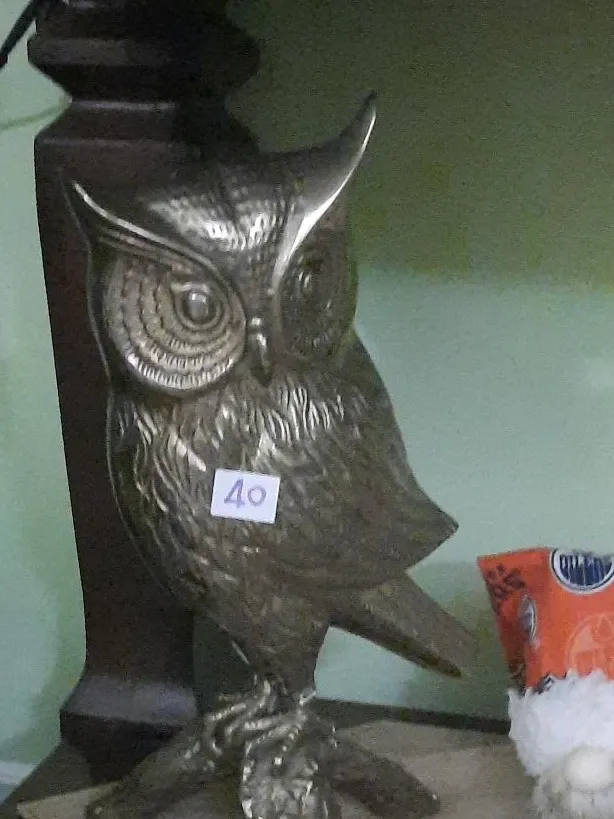 This is a brass owl figurine, likely vintage. It's a decorative piece that adds charm to any shelf. It's a substantial weight and the detailing is quite intricate.