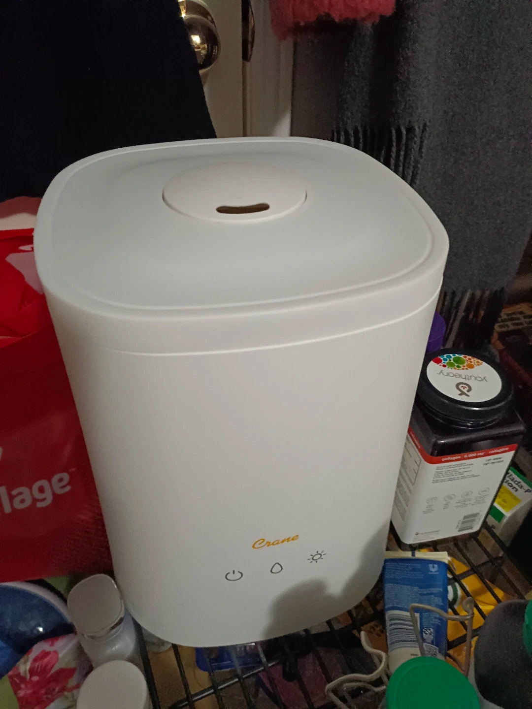This is a white Crane humidifier. It's a portable and easy-to-use appliance. Great for any room in the house!