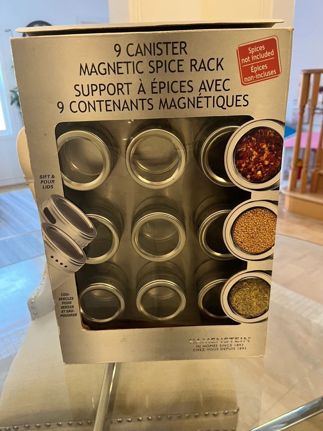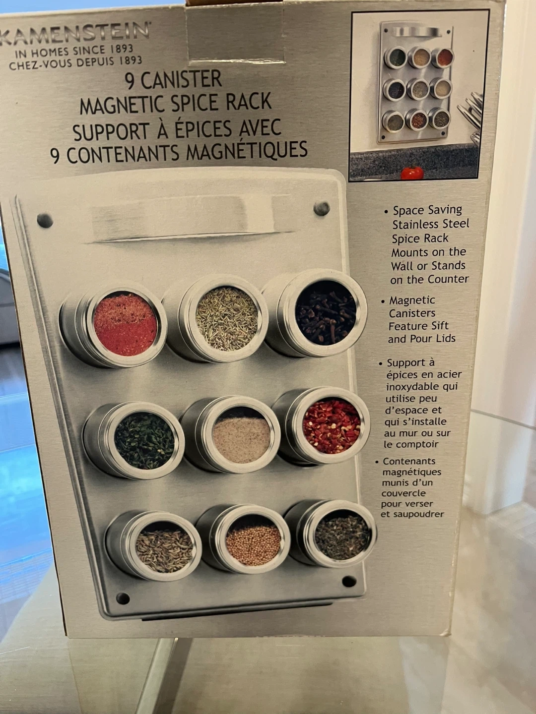 This Kamenstein magnetic spice rack features 9 canisters. It's made of stainless steel and can be mounted on the wall or stand on the counter. Magnetic canisters have sift and pour lids. Spices are not included.