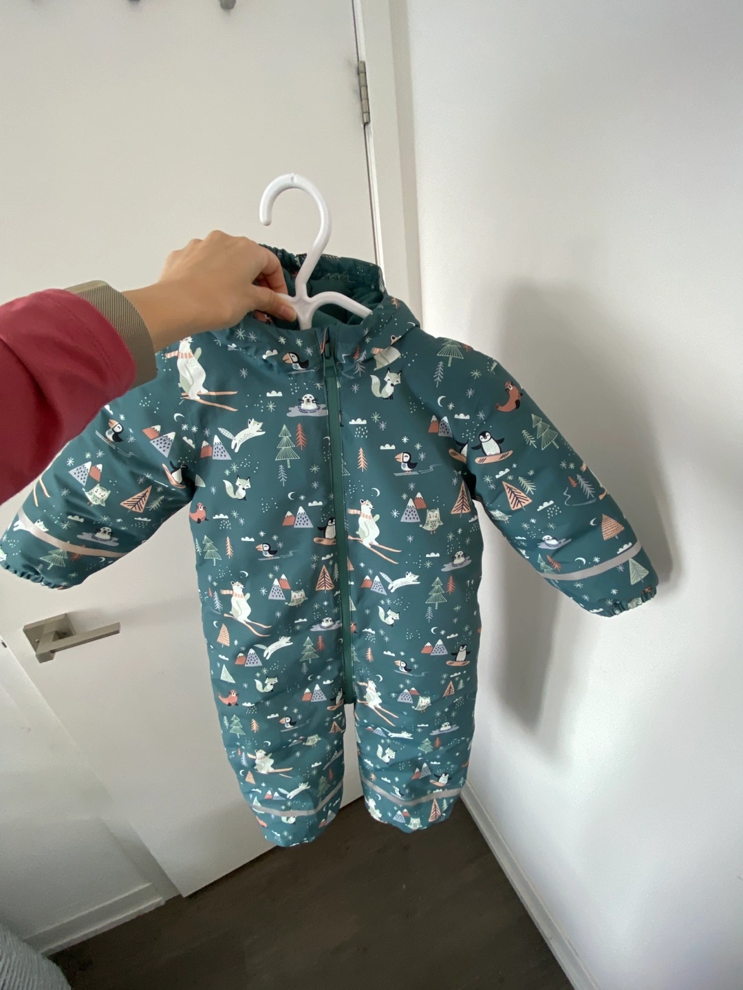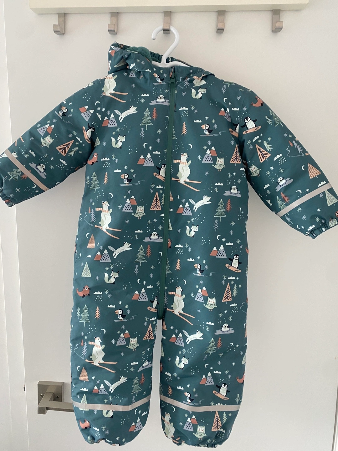 Brand Next. Cute winter snowsuit. Teal colour with adorable arctic animal print. Full zipper closure. Hood included. Great for keeping your little one warm and dry during winter adventures.