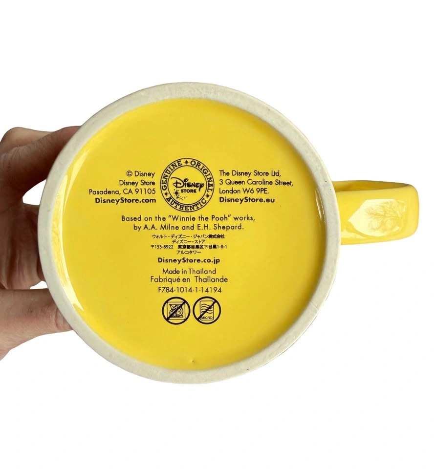 Authentic Disney Store Winnie the Pooh mug with a hidden surprise inside. Official Disney Store item. Features a hidden 3D Winnie the Pooh inside. Bright yellow ceramic with sculpted detail. In excellent condition, with no chips or cracks. Perfect for Disney lovers and collectors, as a gift, or for cozy kitchens. Pick up in Keswick or Newmarket.