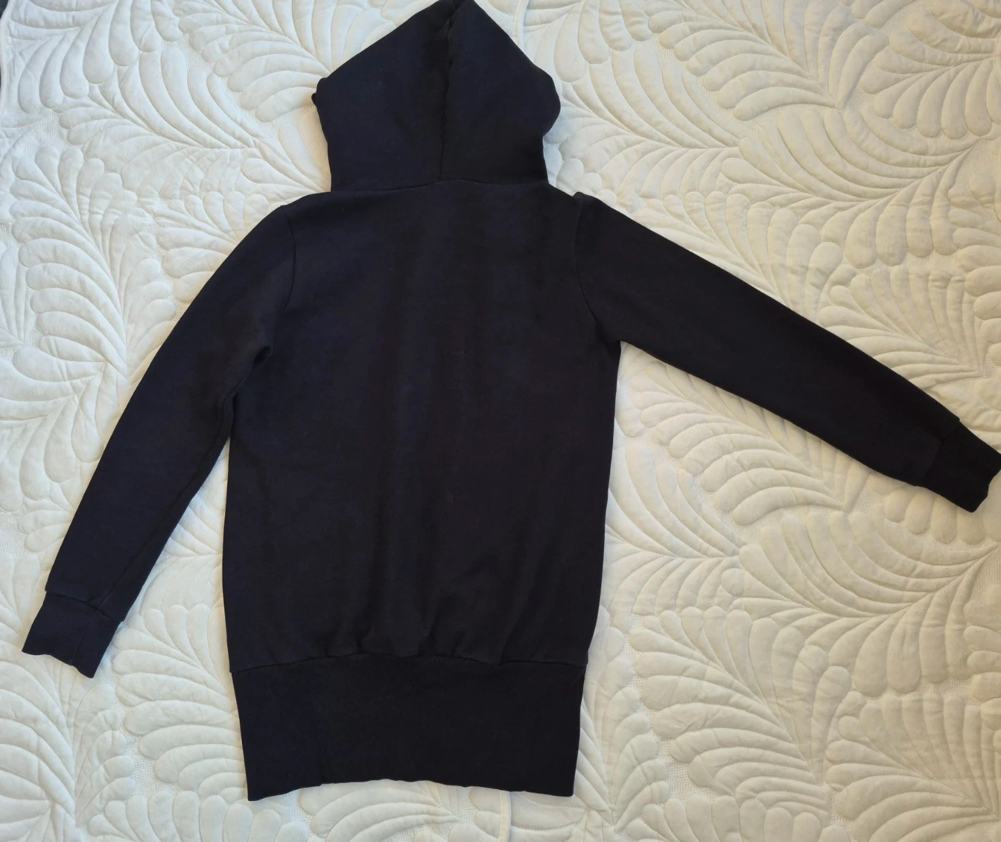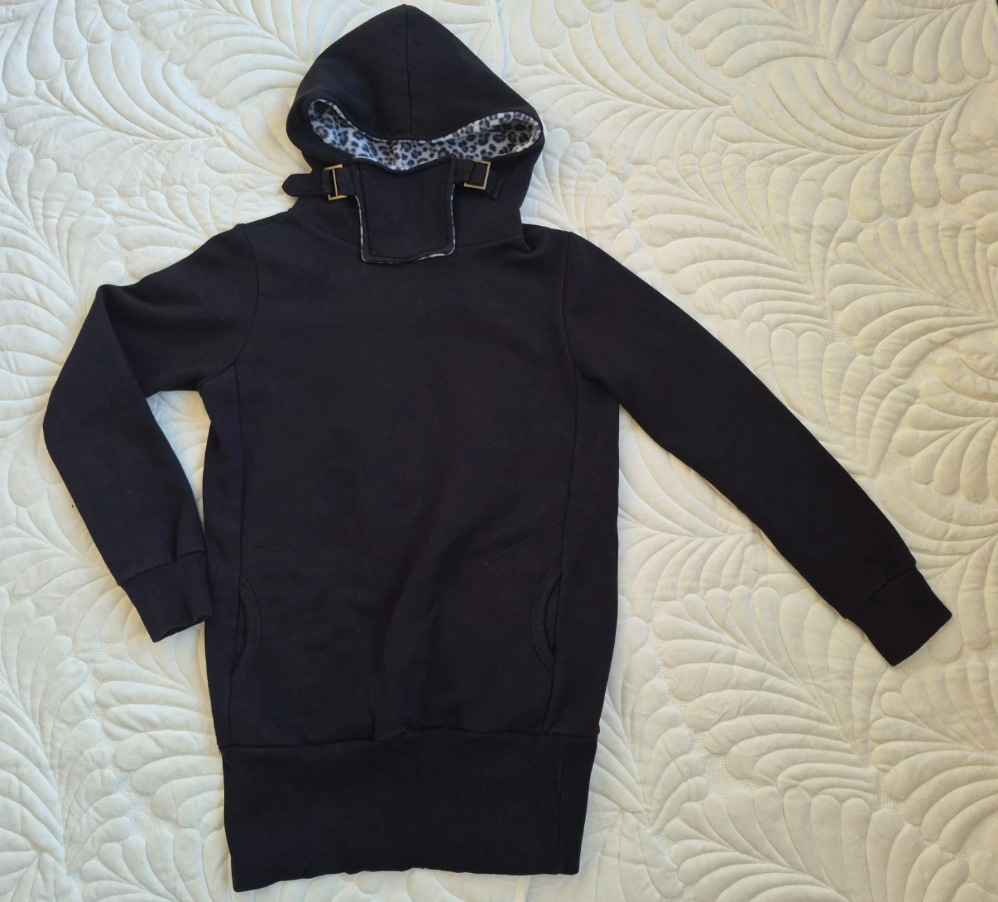 Black hooded sweater with leopard print lining in the hood. Features front pockets. Measures approximately 20 inches from armpit to armpit.