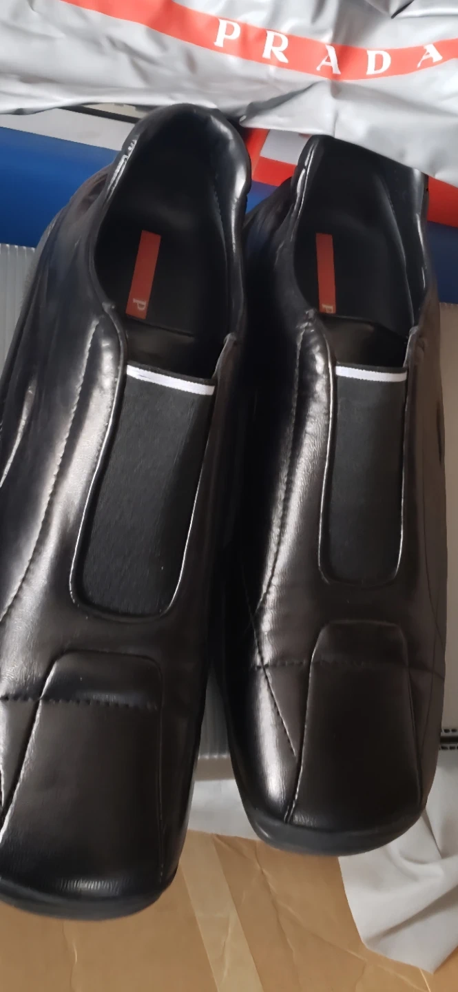 These are Prada unisex black leather dress shoes. They feature a sleek design with a durable sole and come in a size 9.5 The shoe's interior is also leather.