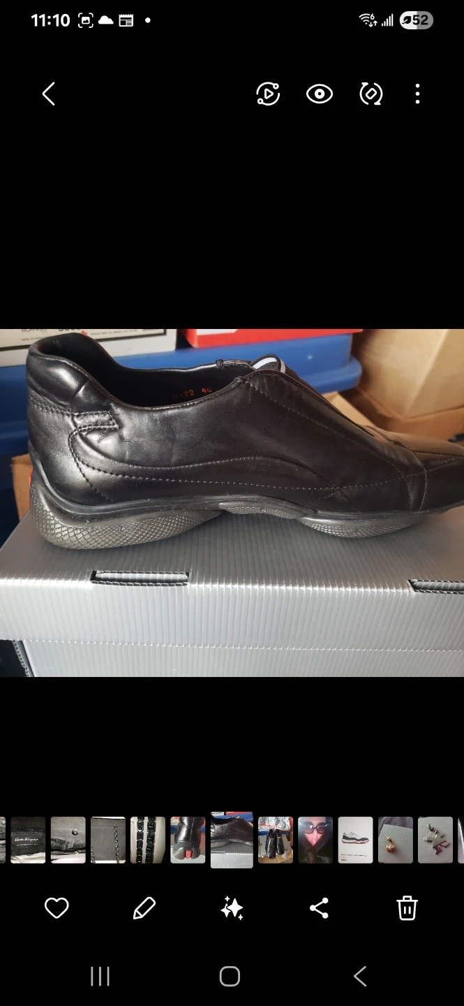 These are Prada unisex black leather dress shoes. They feature a sleek design with a durable sole and come in a size 9.5 The shoe's interior is also leather.