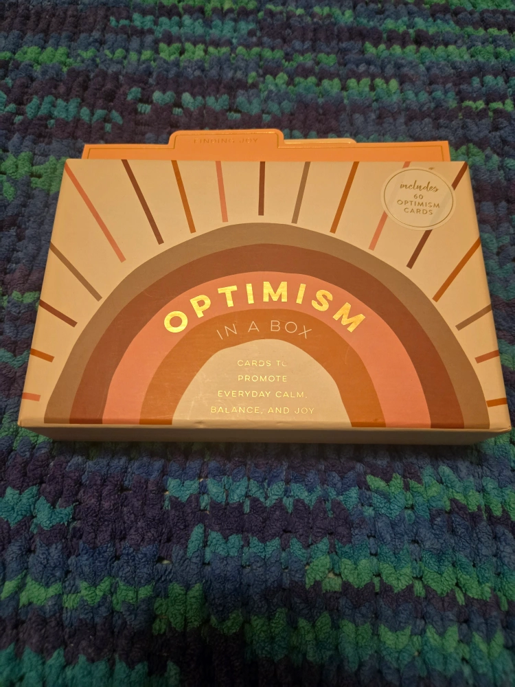 Optimism in a Box includes 60 optimism cards to promote everyday calm, balance, and joy. Never used. Selling for $10, pickup only.