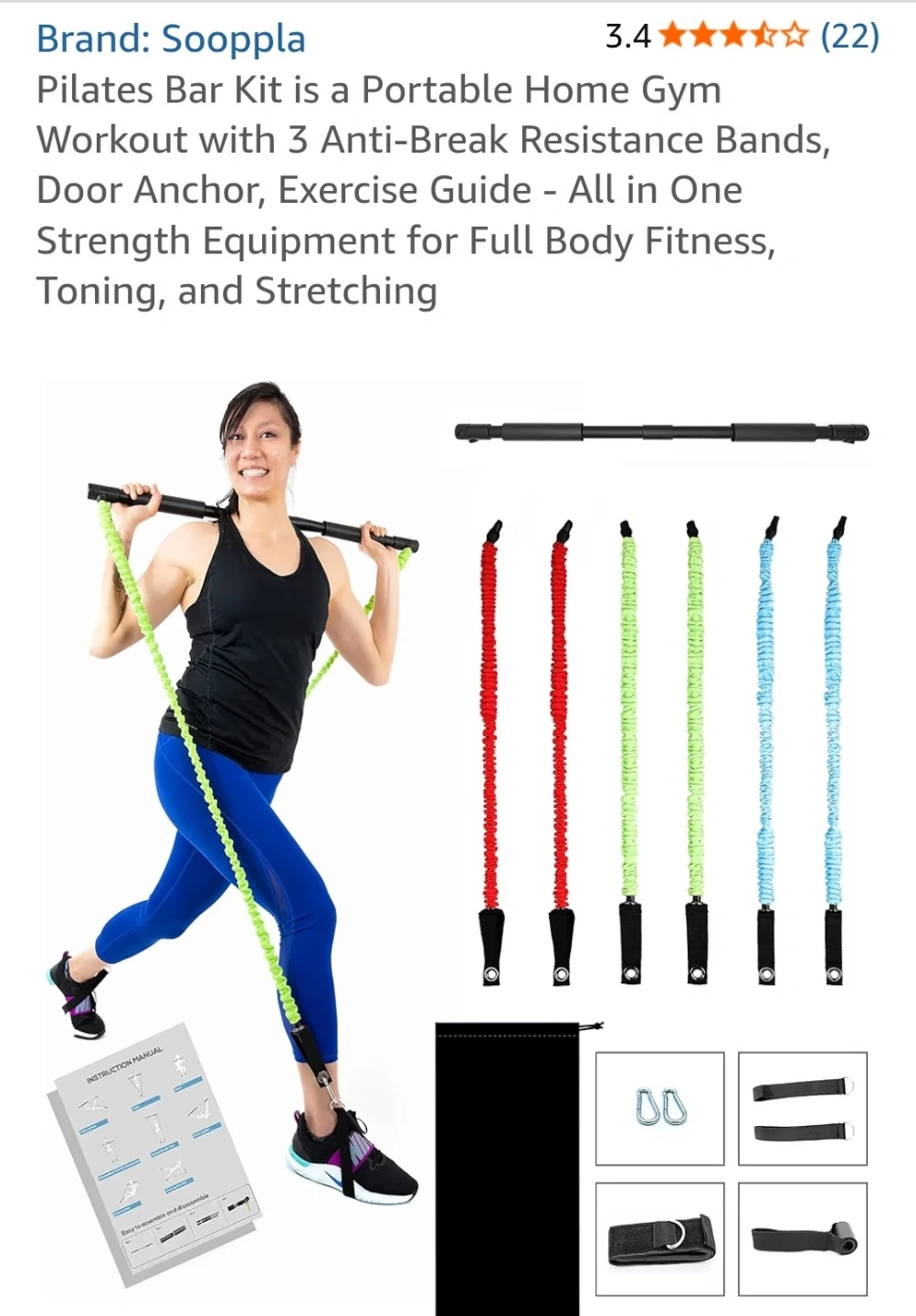 This Sooppla Pilates bar kit is a portable home gym. It includes 3 anti-break resistance bands, a door anchor, and an exercise guide. It's all-in-one strength equipment for full body fitness, toning, and stretching.