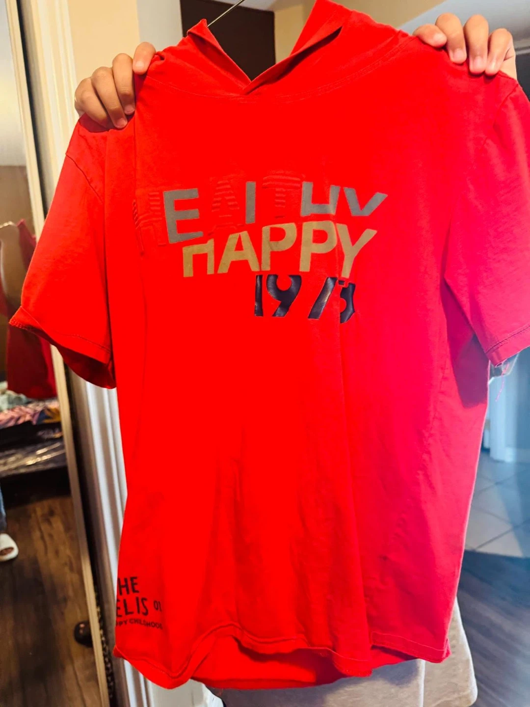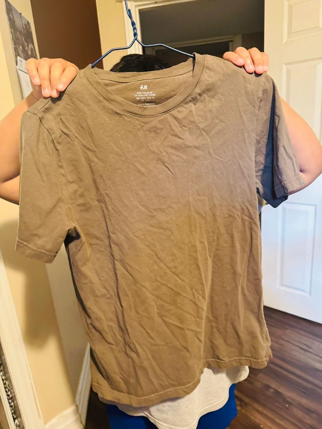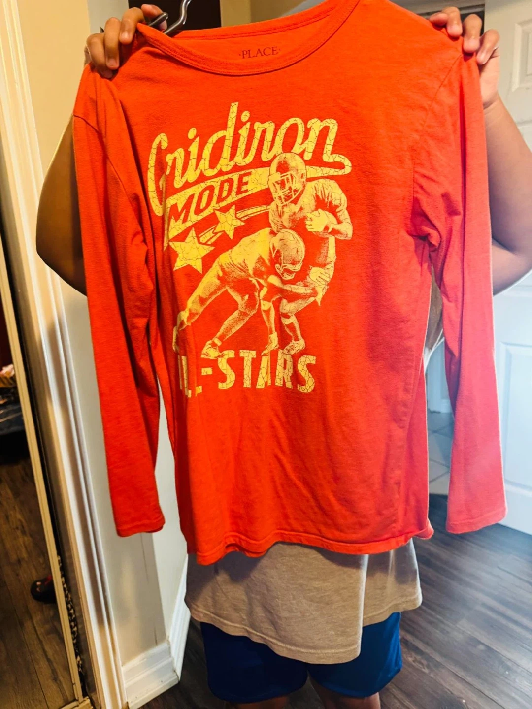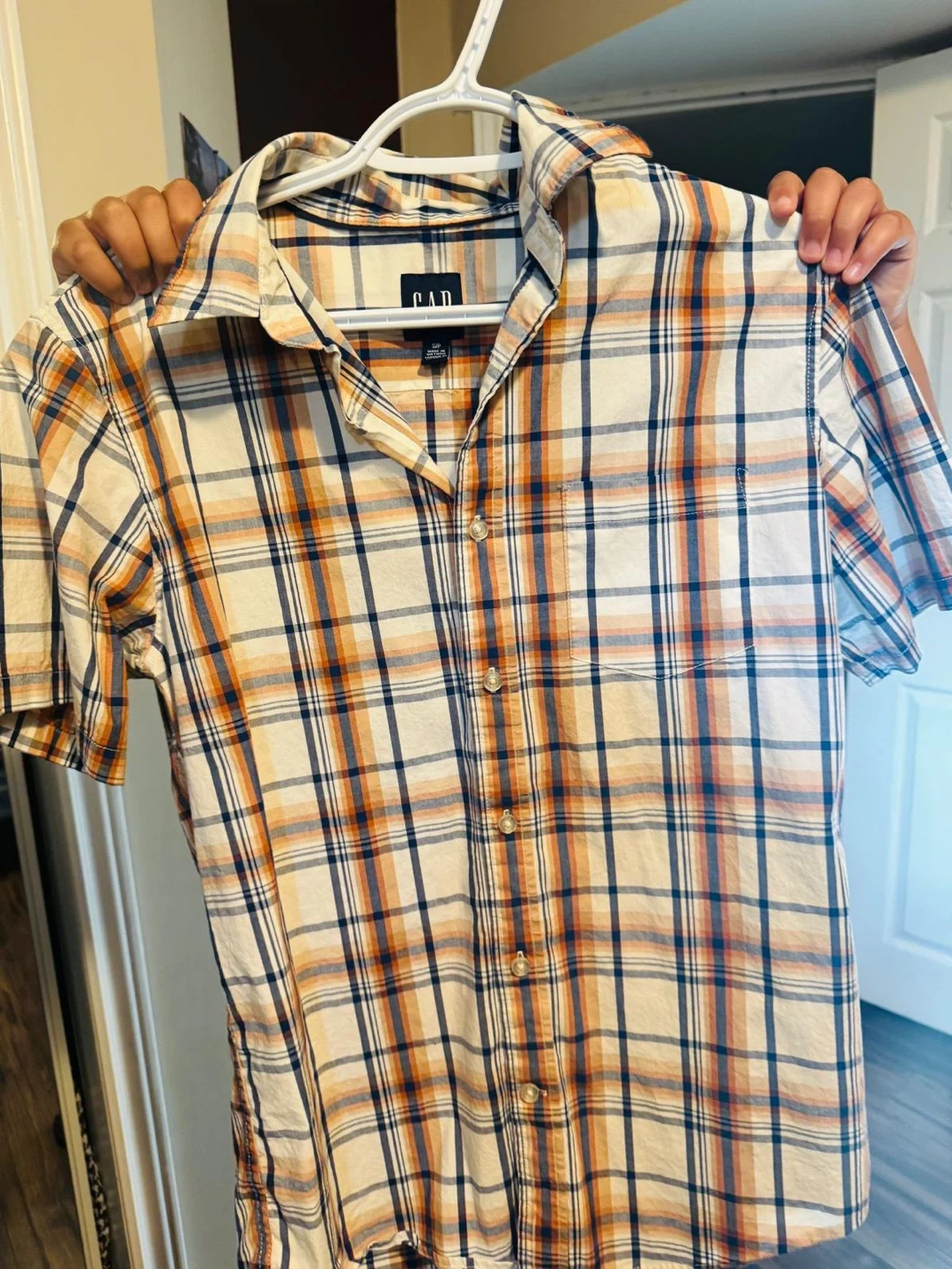 A casual short sleeve button-up shirt from GAP. Features a plaid pattern with orange, blue, and cream colours. Comfortable for everyday wear.