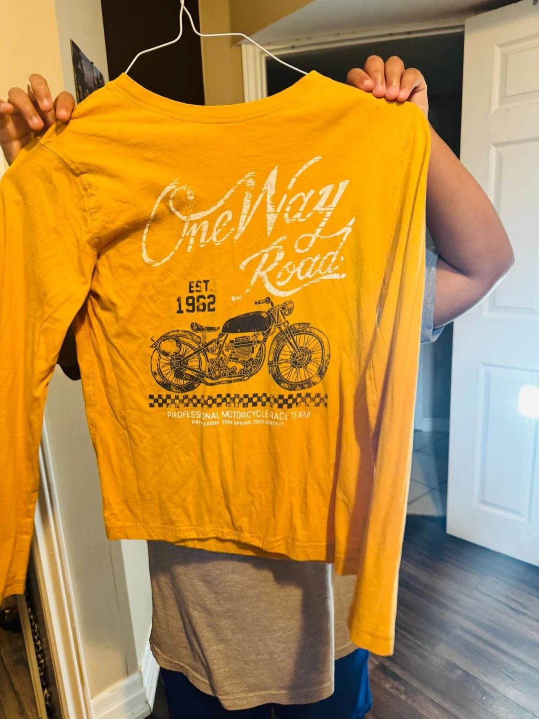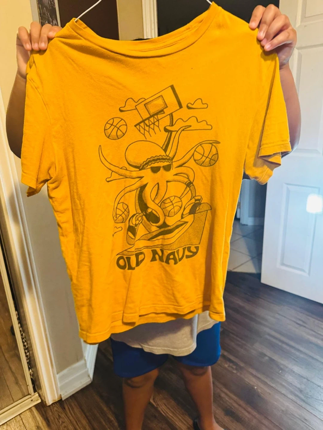 A casual short sleeve button-up shirt from GAP. Features a plaid pattern with orange, blue, and cream colours. Comfortable for everyday wear.