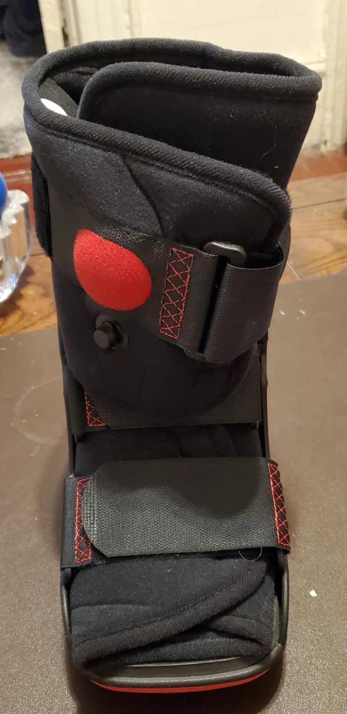 This is a black walking boot to secure your injured foot. It's a size small. Its a pneumatic, lightweight walking boot designed for moderate-to-severe sprains, stable fractures, and post-operative immobilization. Almost new .. only wore it one day.