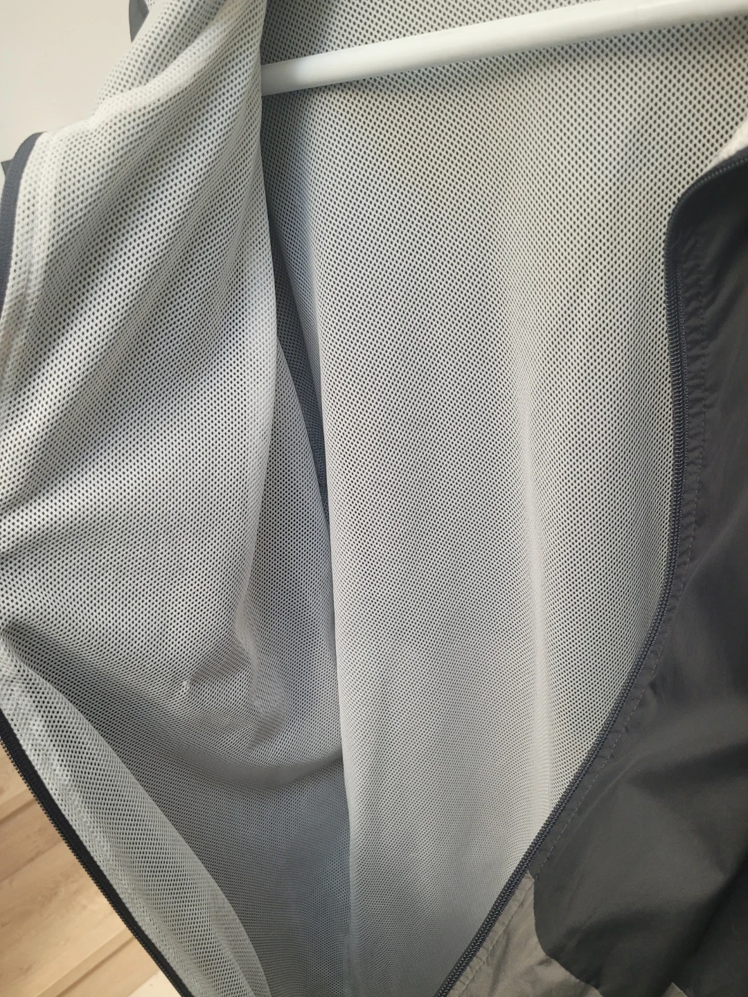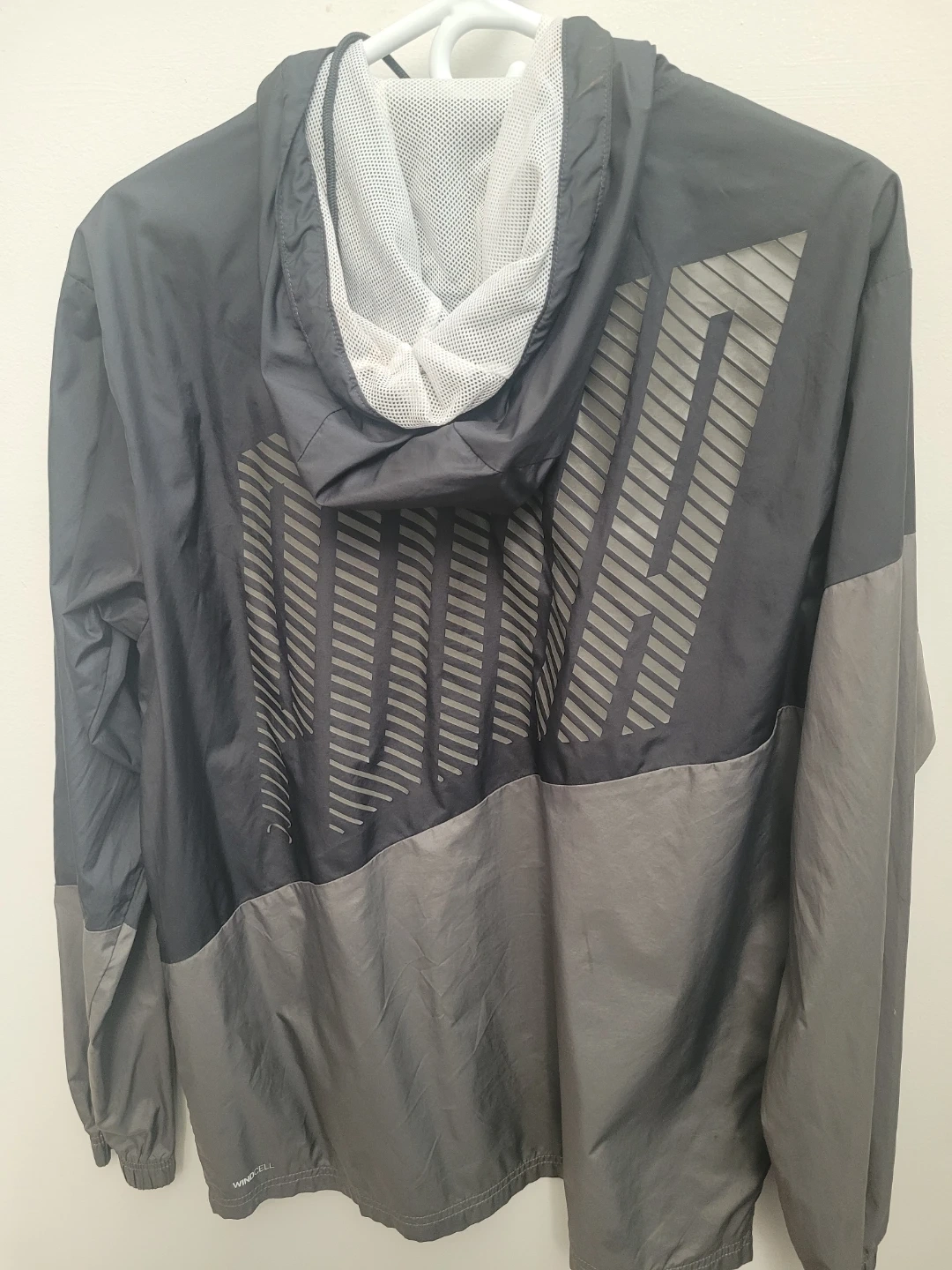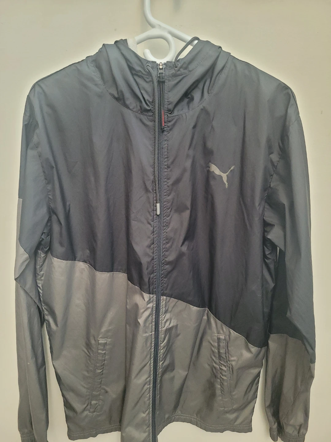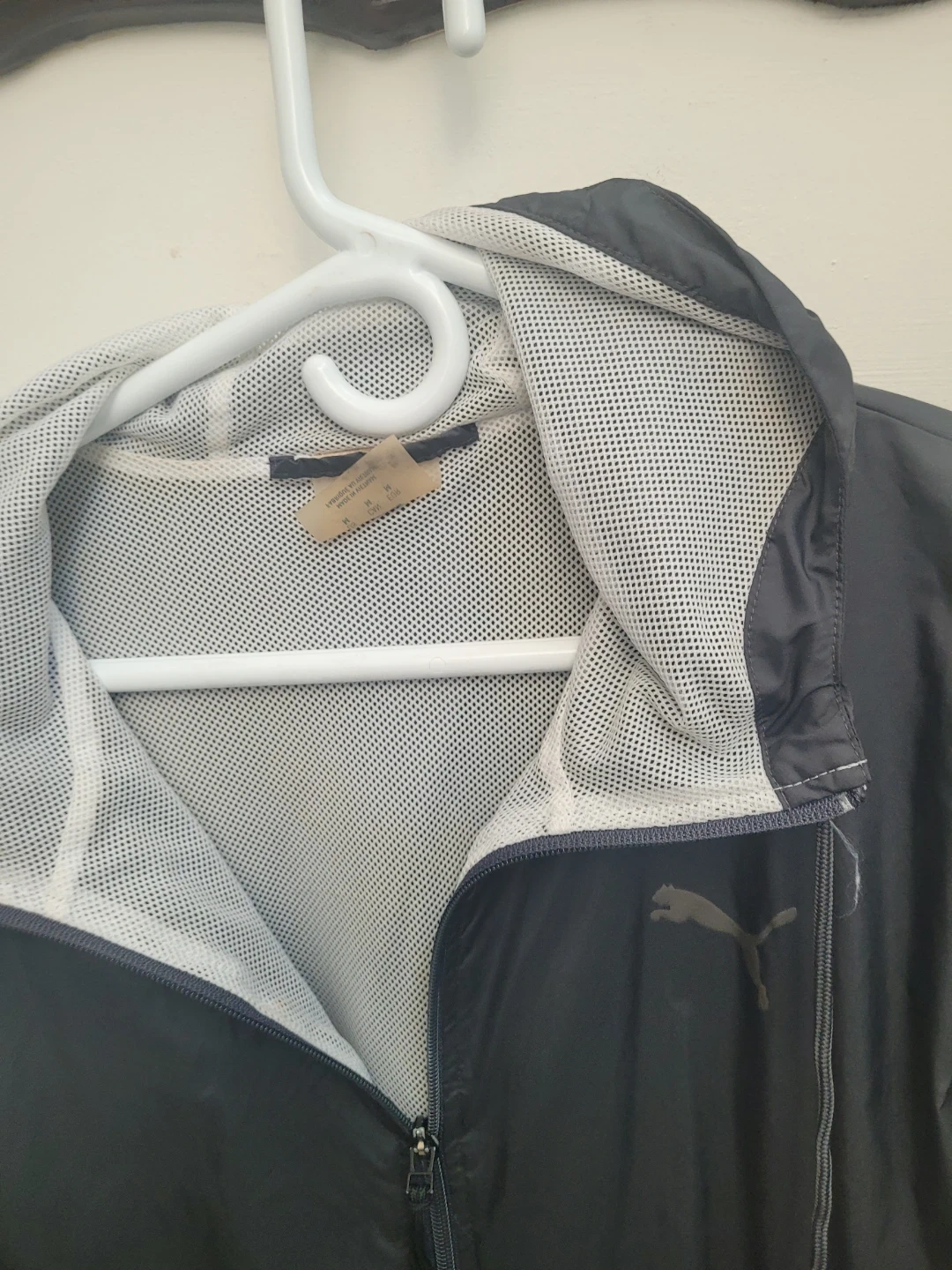 This Puma windbreaker jacket is grey and black. It's a size medium with a hood. It's made with lightweight material for active days.