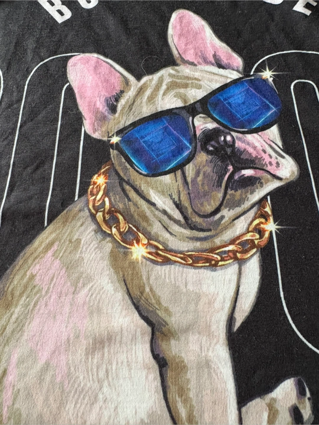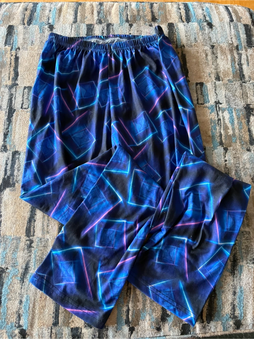 Comfortable pajama set featuring a cool French bulldog graphic on the shirt and geometric neon pattern on the pants. The shirt says 'BORN TO BE COOL'. Great for lounging!