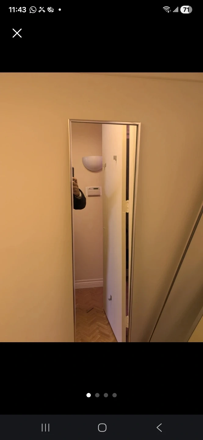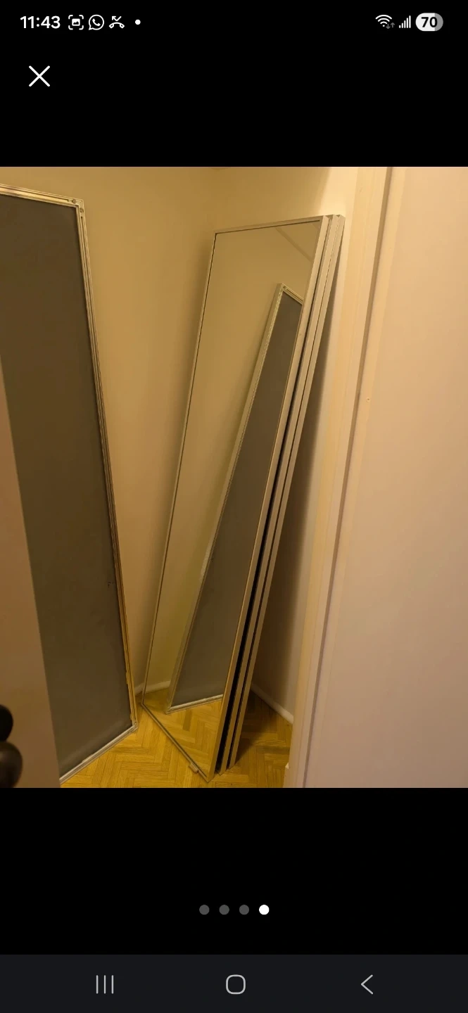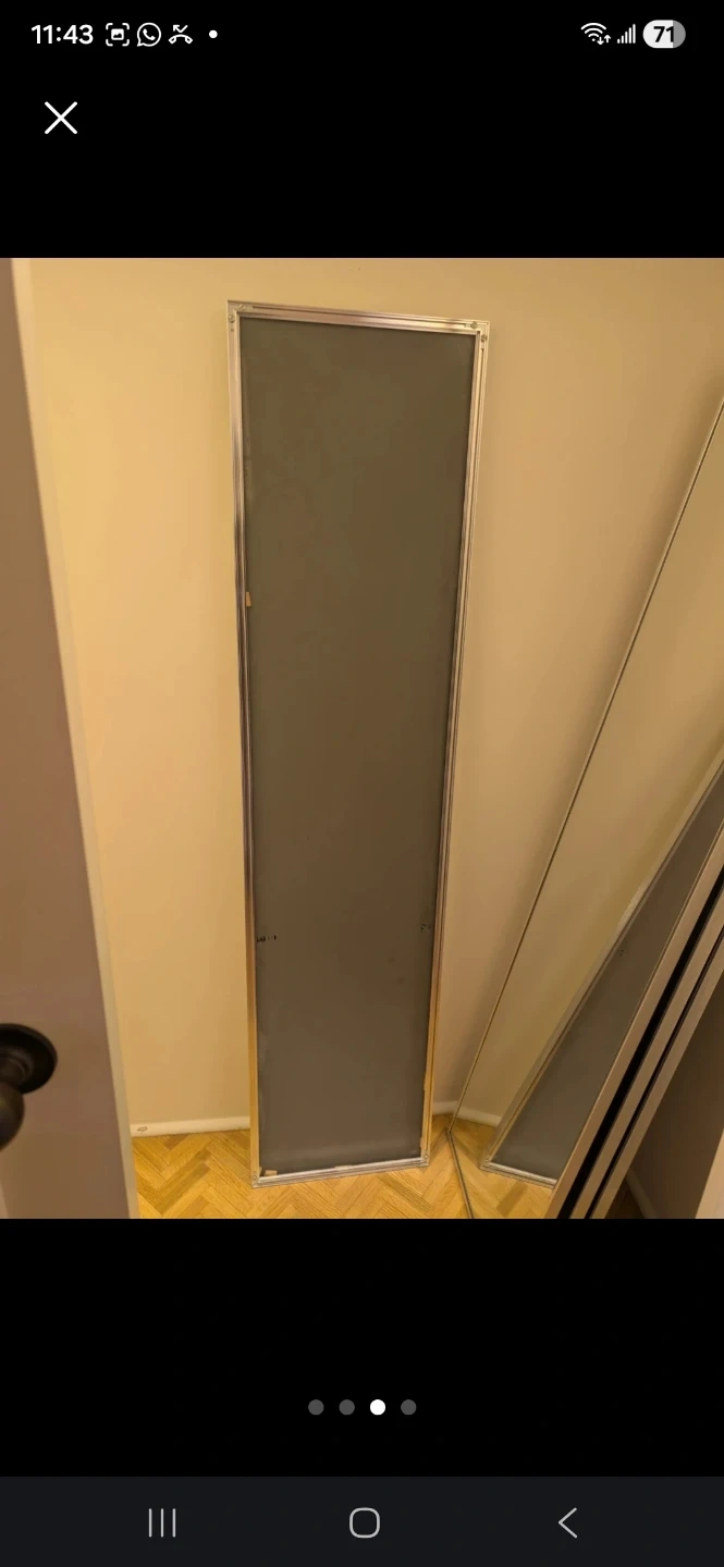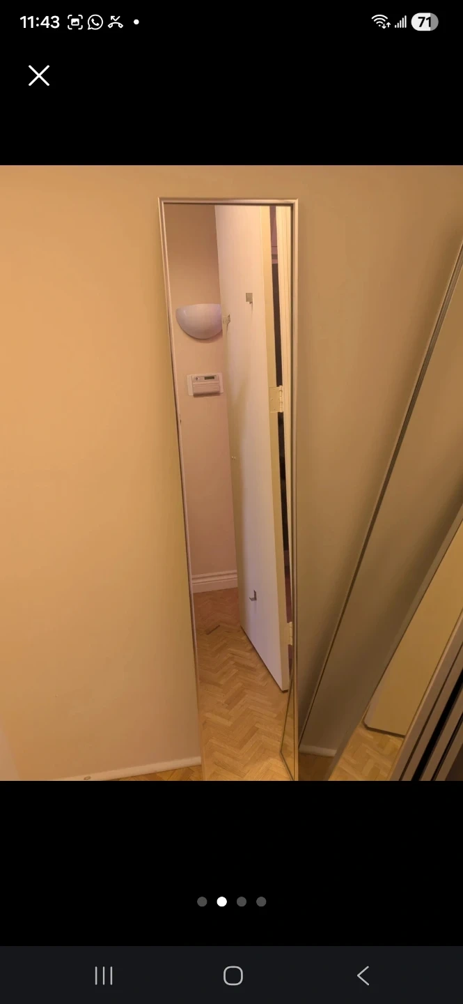 A tall, slim mirror with a silver frame. It's perfect for checking your outfit before heading out. Great for small spaces or narrow hallways.