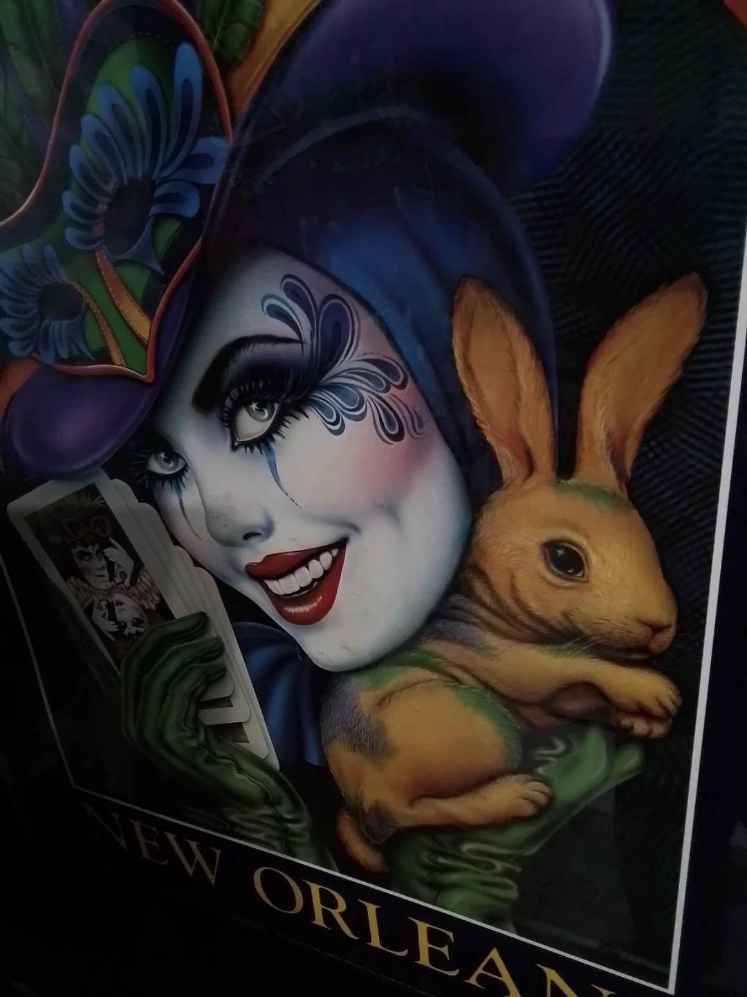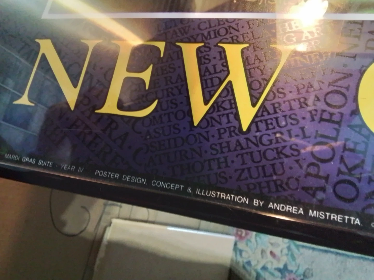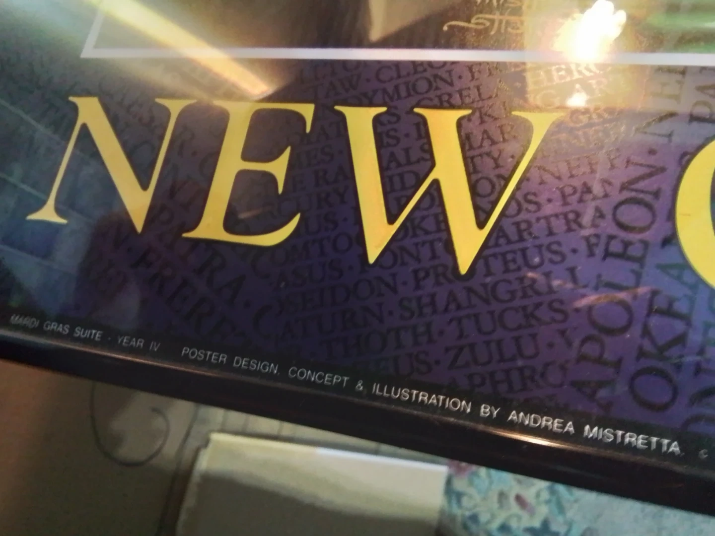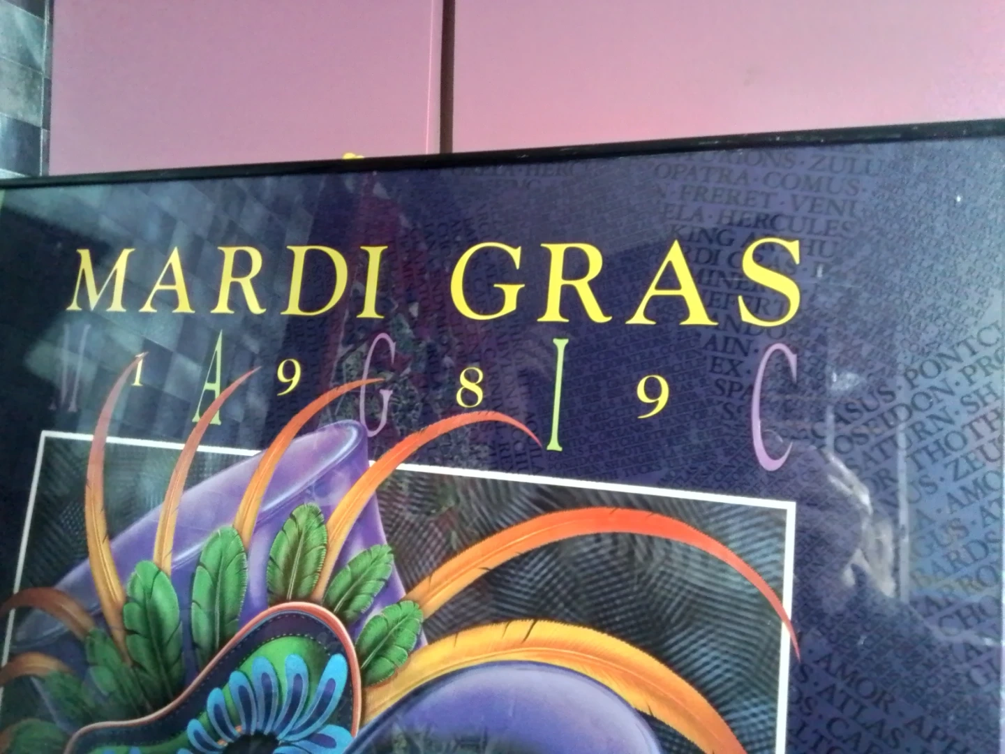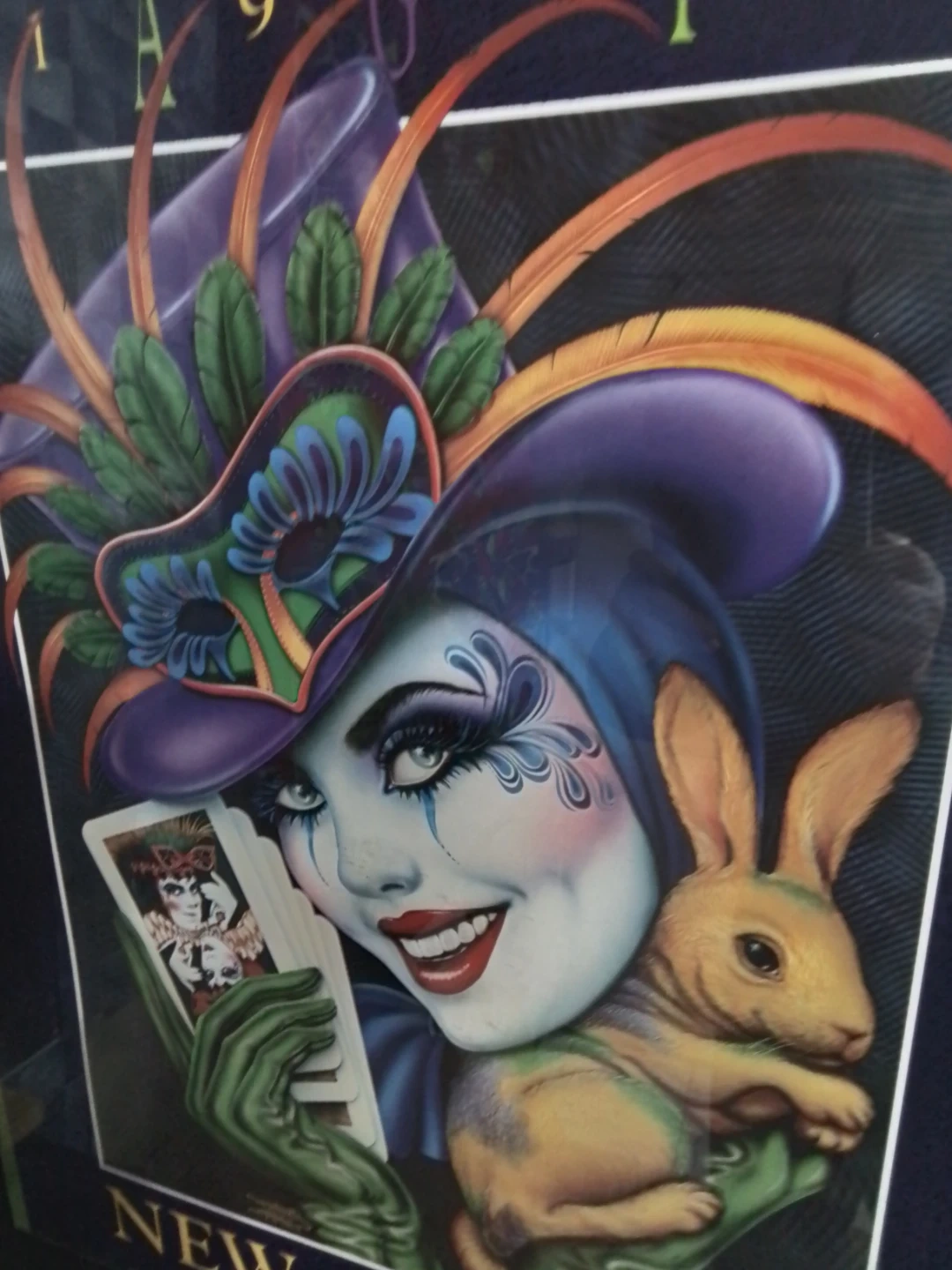 This vintage Mardi Gras New Orleans framed poster, measuring 24.5 x 32 inches, captures the vibrant essence of the 1989 celebration. The artwork features a captivating lady holding a rabbit with a backdrop that's rich in Mardi Gras flair.