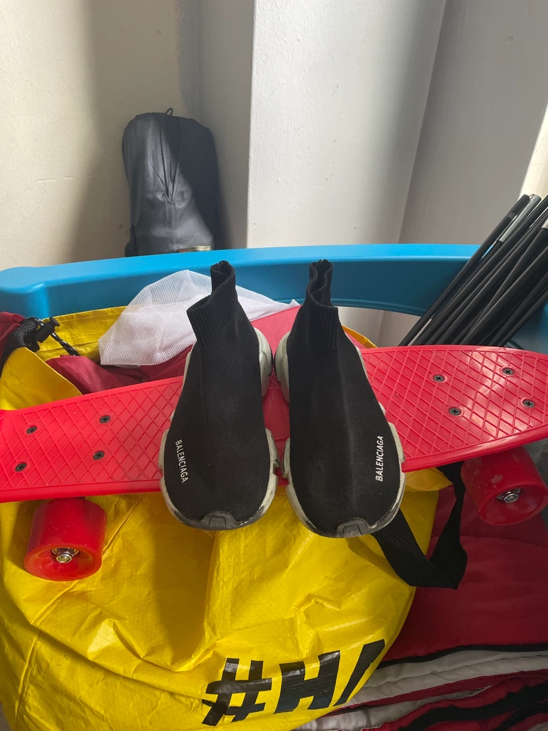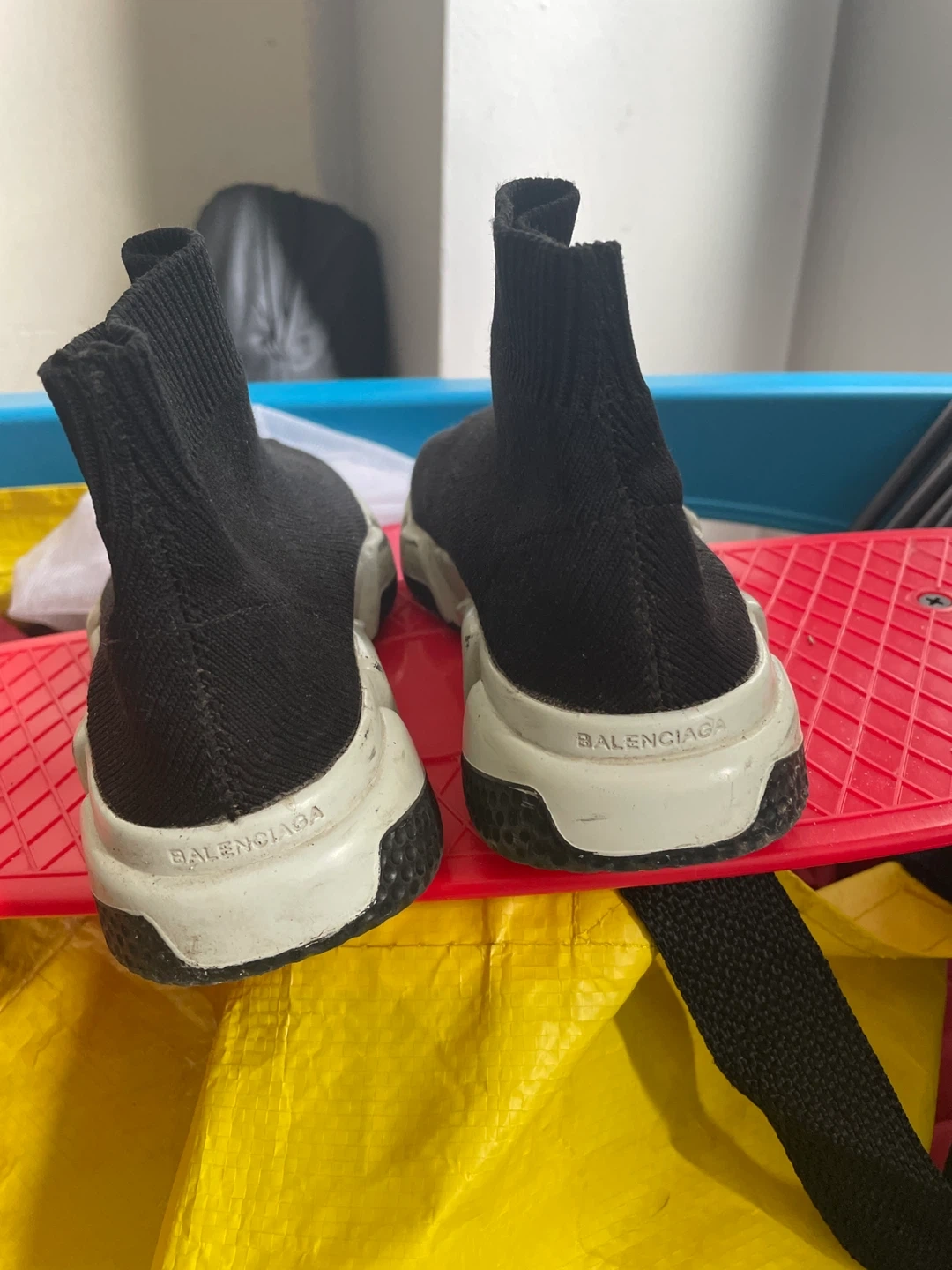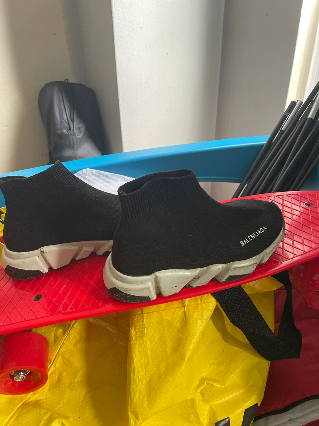 These Balenciaga sneakers have a sock-like fit and a chunky sole. They're black with white accents, my son absolutely loved the comfort of these shoes. They just need to be wiped down. Size 12 -13 kids