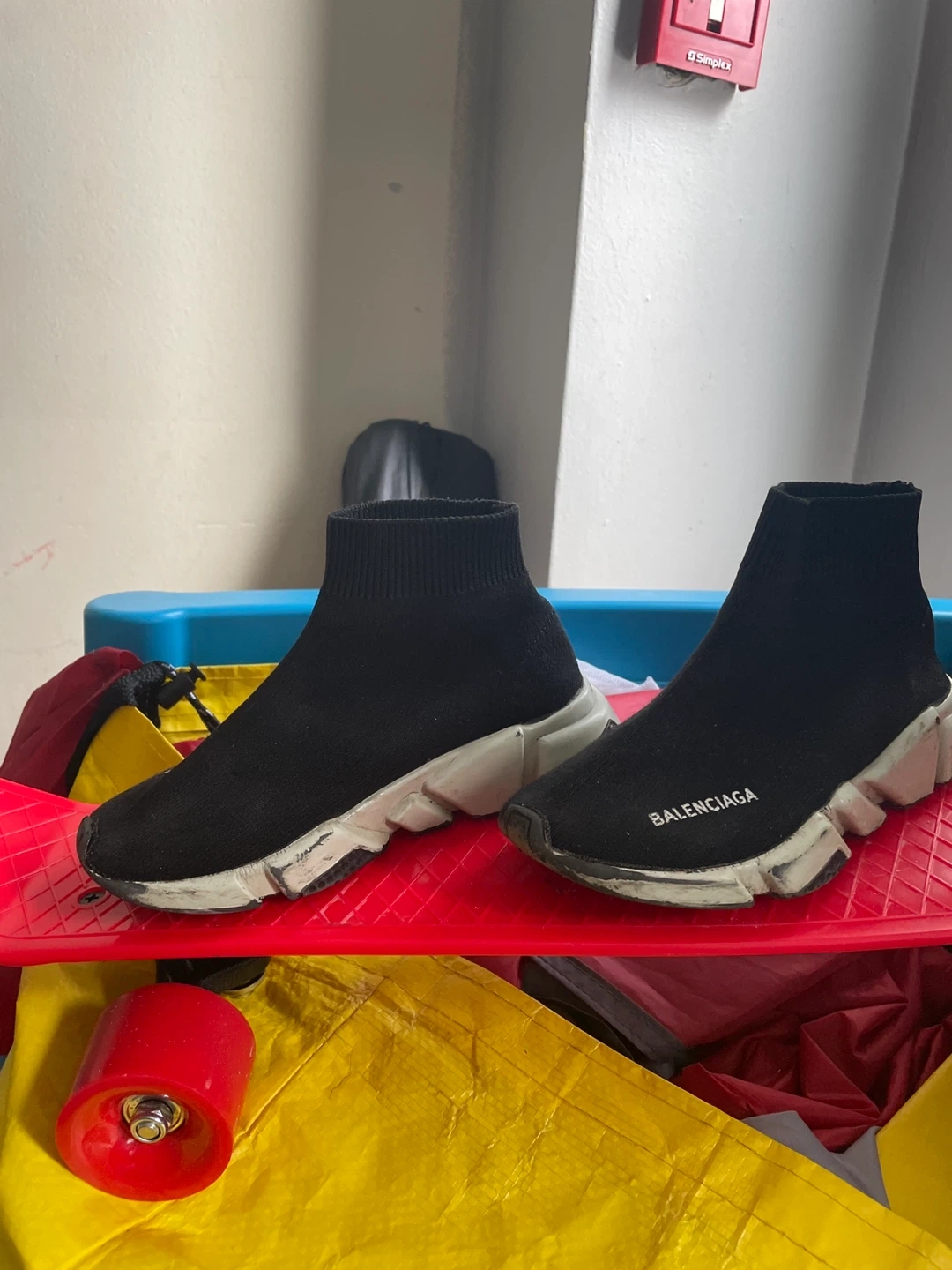 These Balenciaga sneakers have a sock-like fit and a chunky sole. They're black with white accents, my son absolutely loved the comfort of these shoes. They just need to be wiped down. Size 12 -13 kids