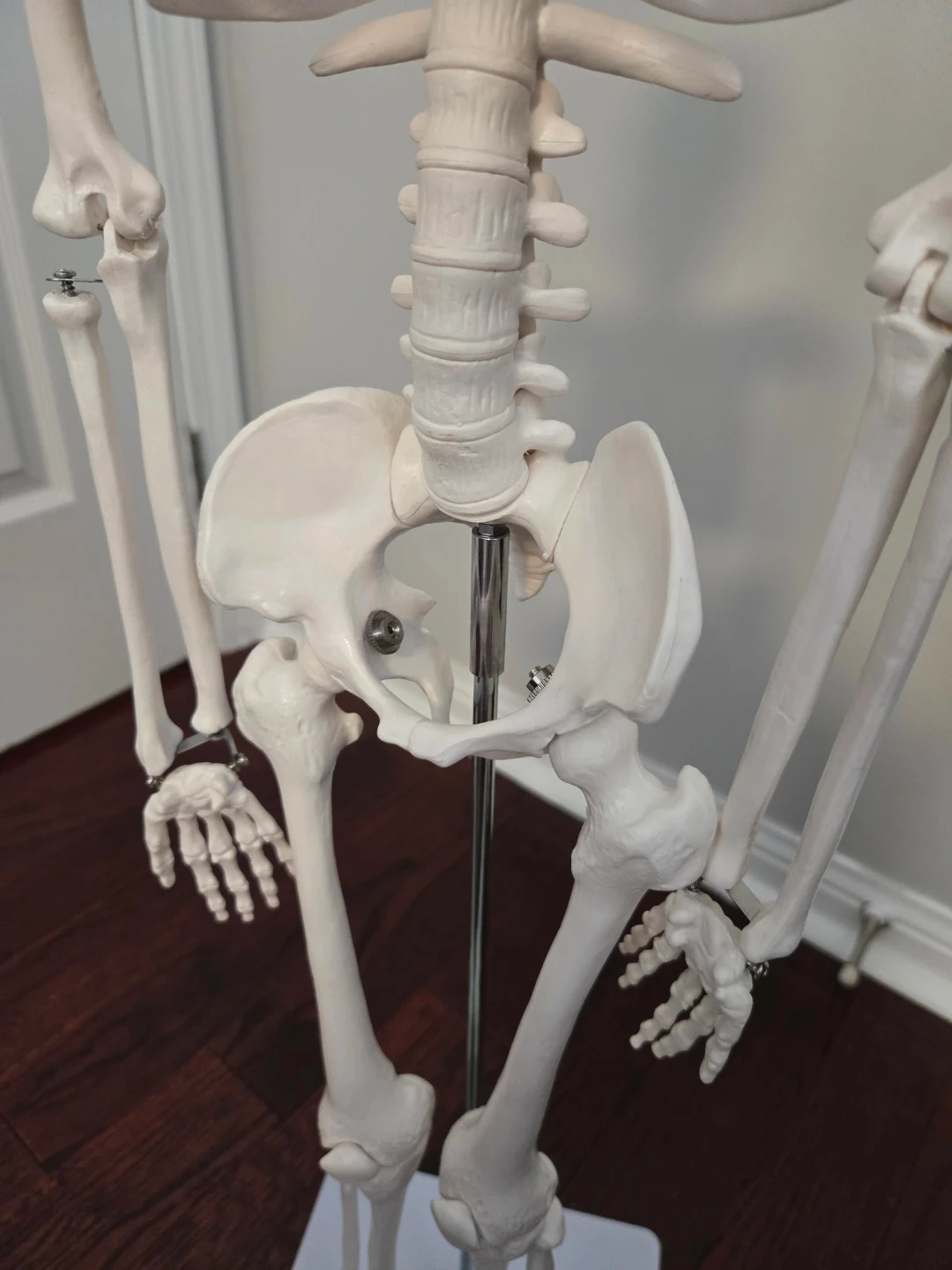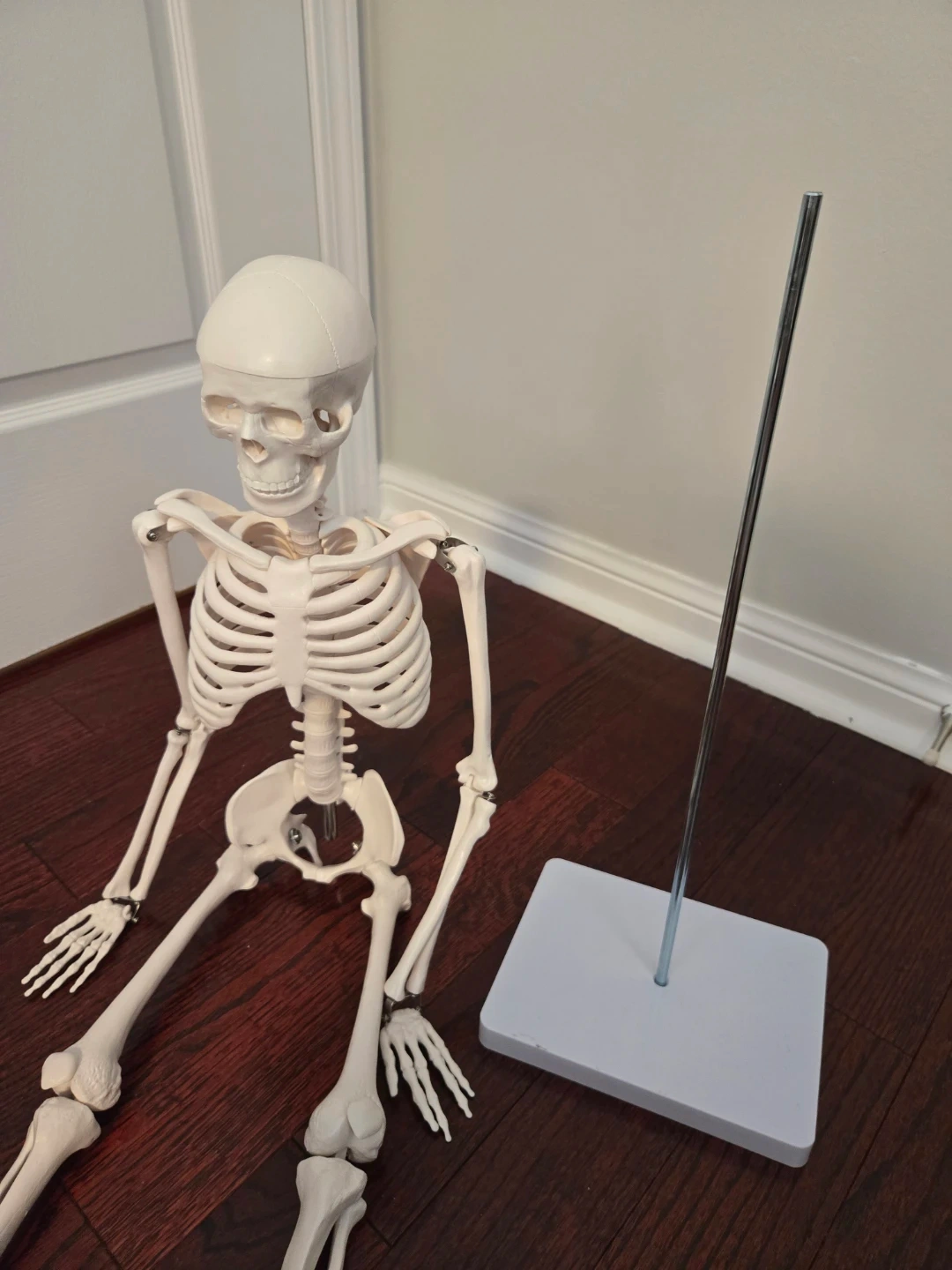 This is a human skeleton model, great for educational purposes. It's made of durable plastic and includes a metal stand for display. The model is around 3 feet tall. I used it for my anatomy class and it really helped as the bones rotate to mimic actions.