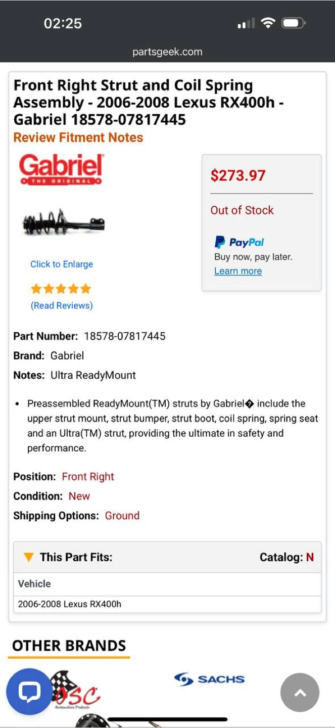 Brand new Gabriel Ultra ReadyMount 18578 front right strut and coil spring assembly for Lexus RX400h 2006β2008.