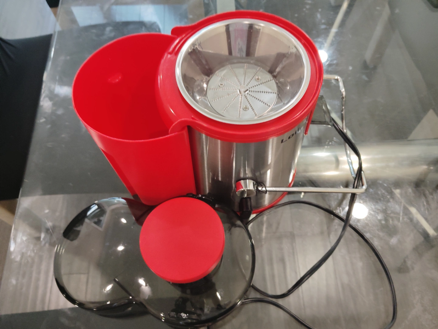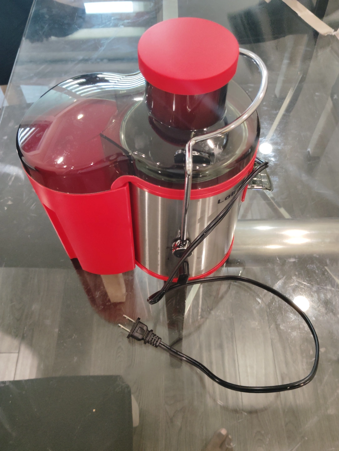 Red and stainless steel juicer. Includes pulp container and power cord. Excellent for juicing oranges, lemons, limes, watermelon, apples, mangos and all types of fruit.