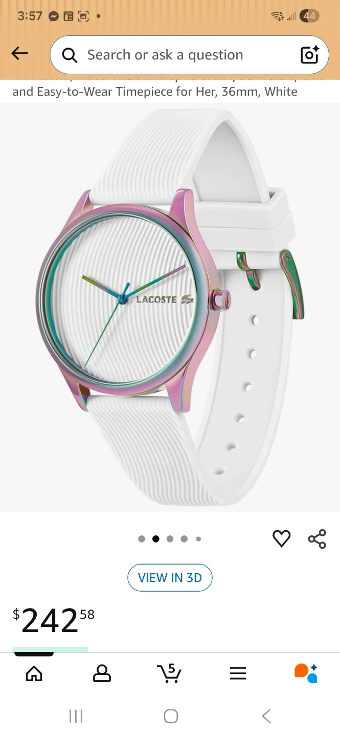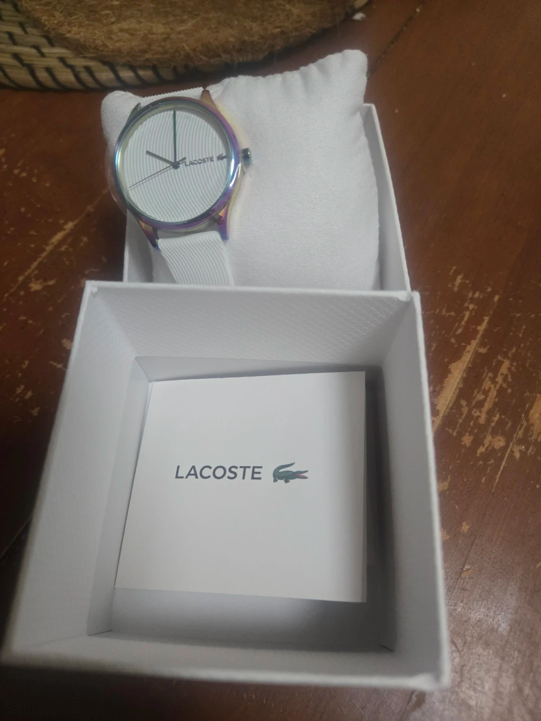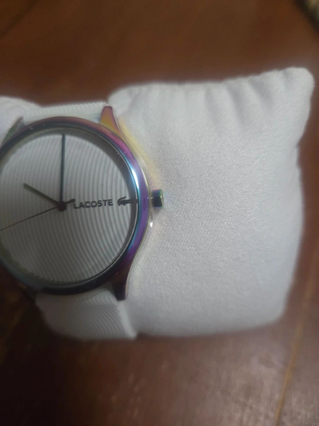A stylish Lacoste women's watch with a white silicone strap and a iridescent bezel. The watch face is white with colourful accents on the hands. It comes with the original box. Case size is 36mm.