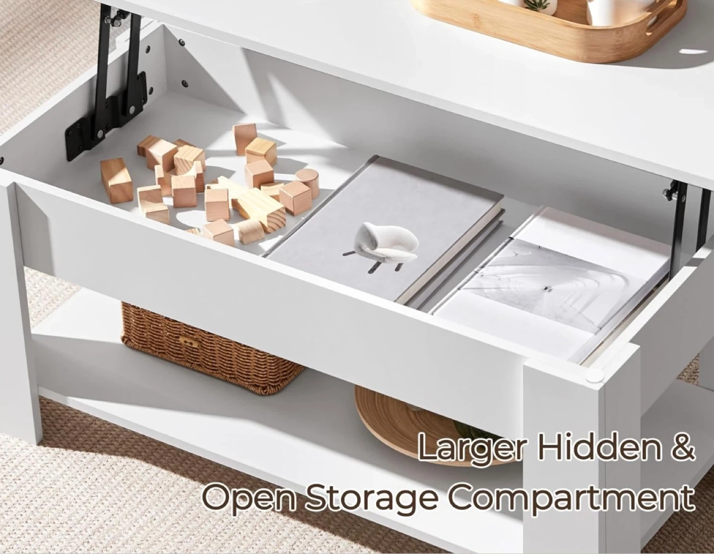 I'm selling a brand new, in-box Yaheetech lift-top coffee table! It's white and has a storage compartment underneath the lift top. The item number is 610904. The dimensions are approximately 39" x 20" x 22" when raised. The box is included!