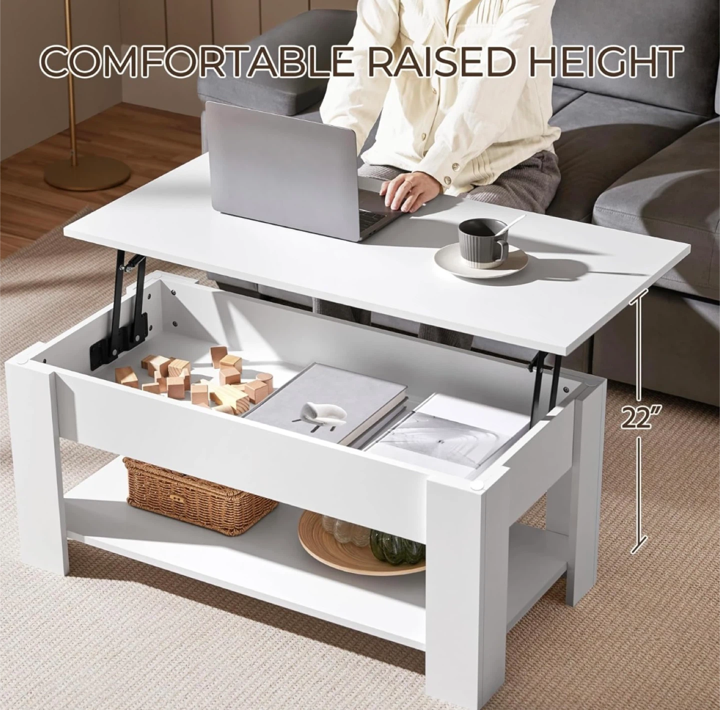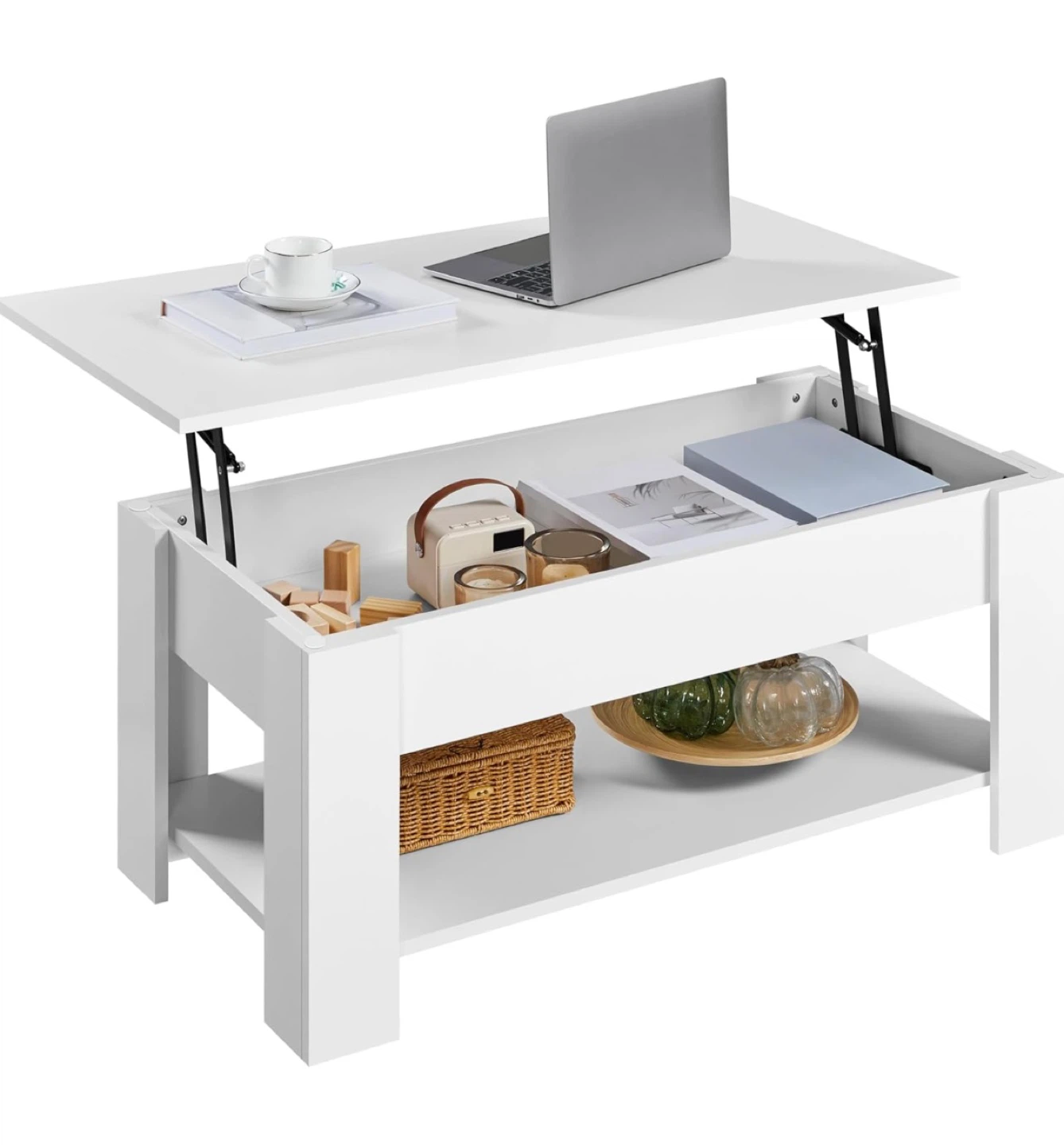 I'm selling a brand new, in-box Yaheetech lift-top coffee table! It's white and has a storage compartment underneath the lift top. The item number is 610904. The dimensions are approximately 39" x 20" x 22" when raised. The box is included!