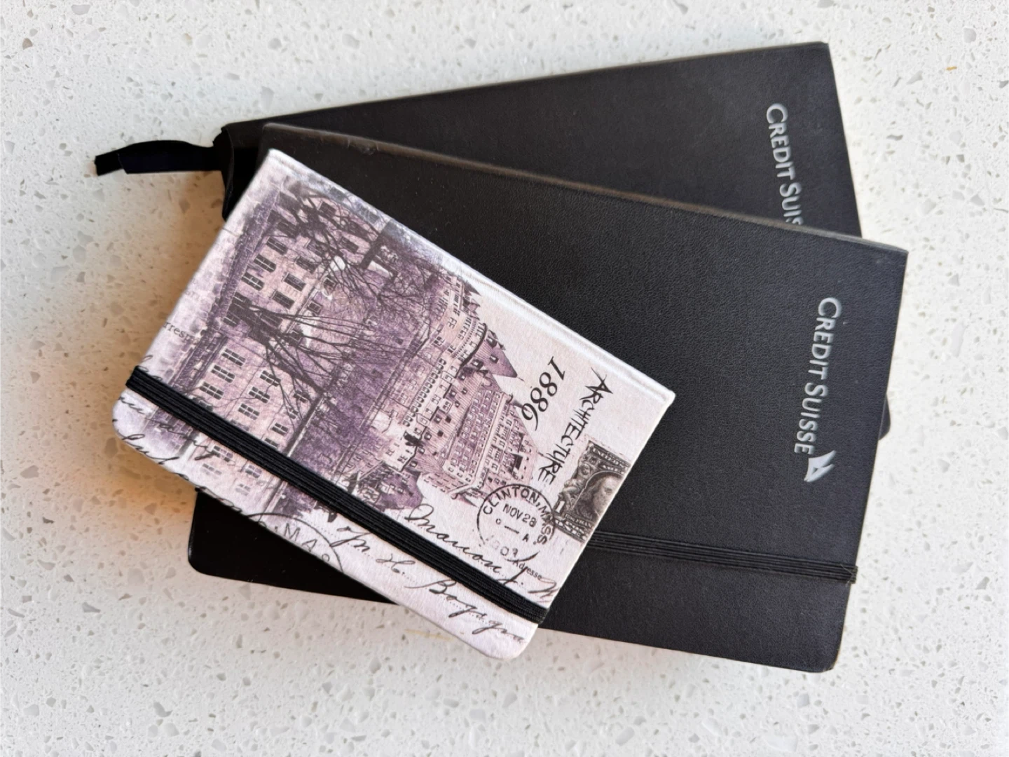 Set of two black Credit Suisse notebooks. One features an architectural design with a vintage postage stamp.