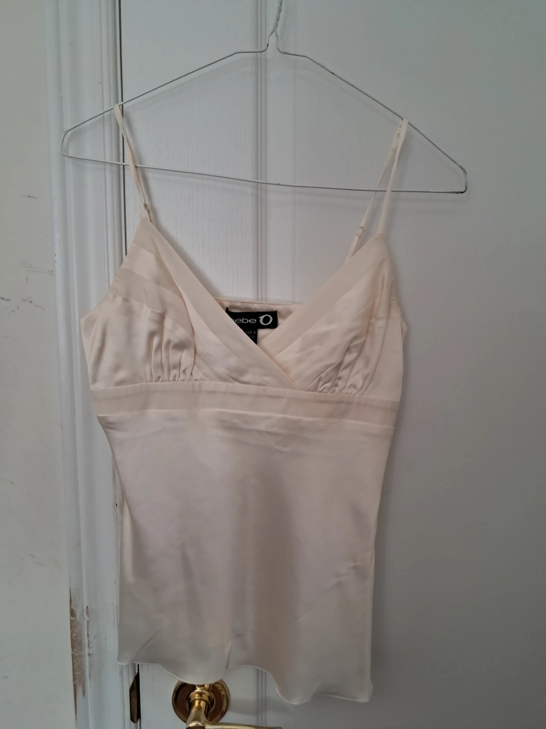 Selling a cute Bebe top in size XS! It's made of a blend of 95% silk and 5% spandex, so it feels really nice. The colour is ivory. Perfect for a night out or dressing up a casual outfit