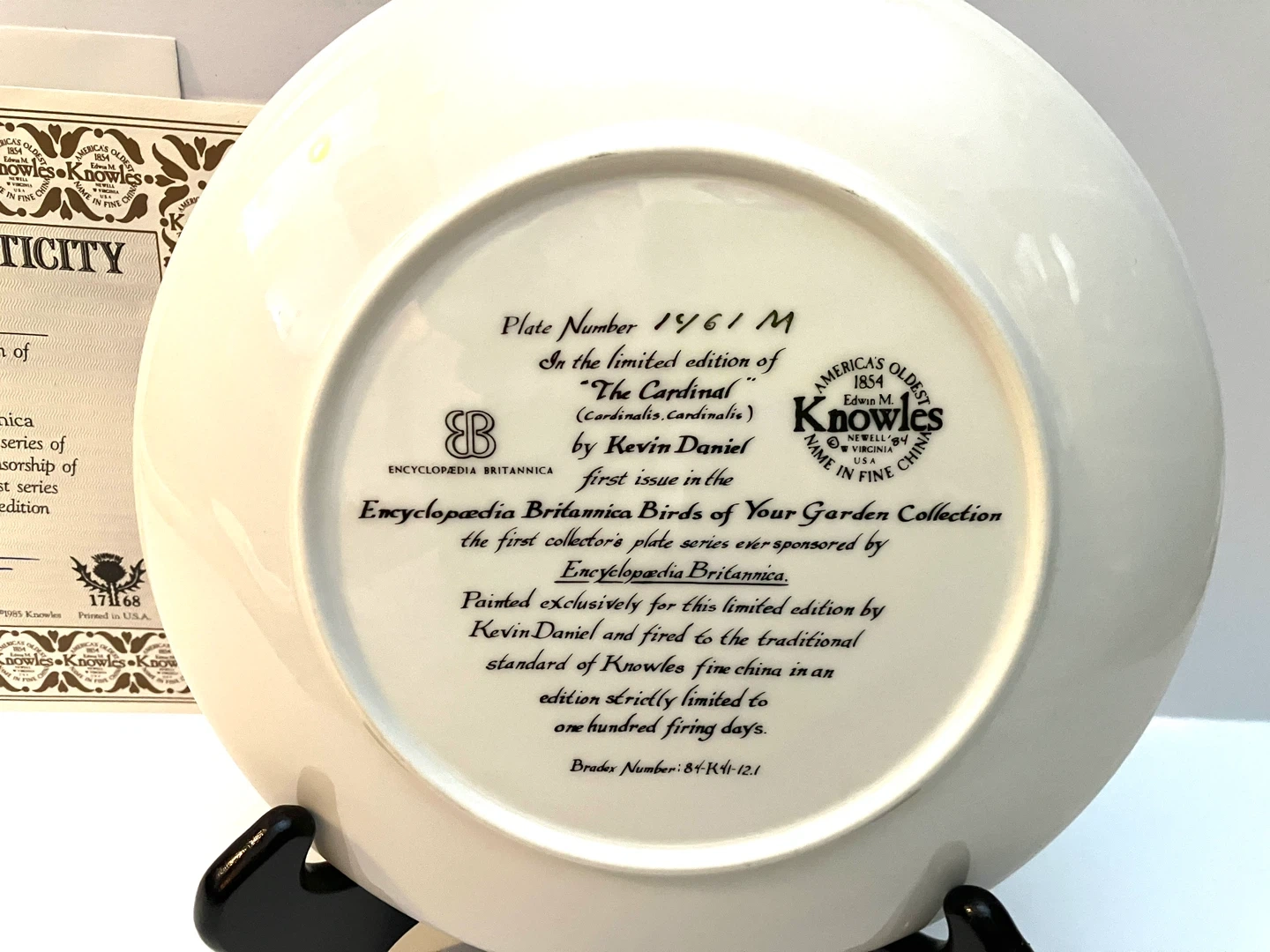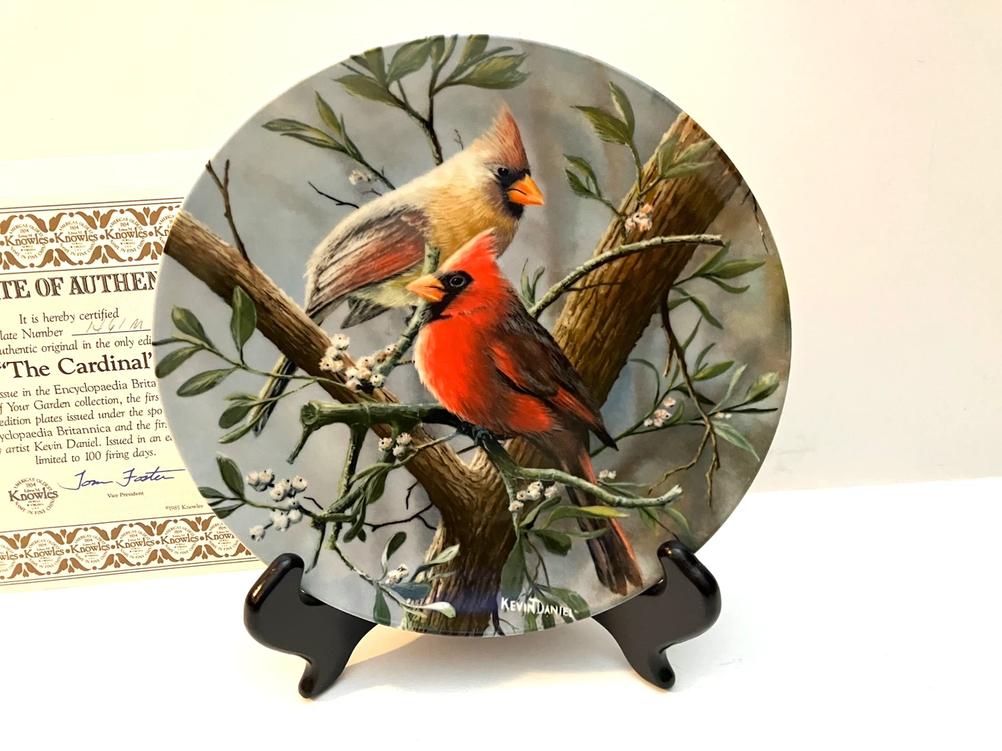 beautiful Knowles collector plate titled "The Cardinal". It's the first issue in the Encyclopedia Britannica Birds of Your Garden Collection, painted by Kevin Daniel. This plate is in excellent condition and ready to be displayed! With box and certificate