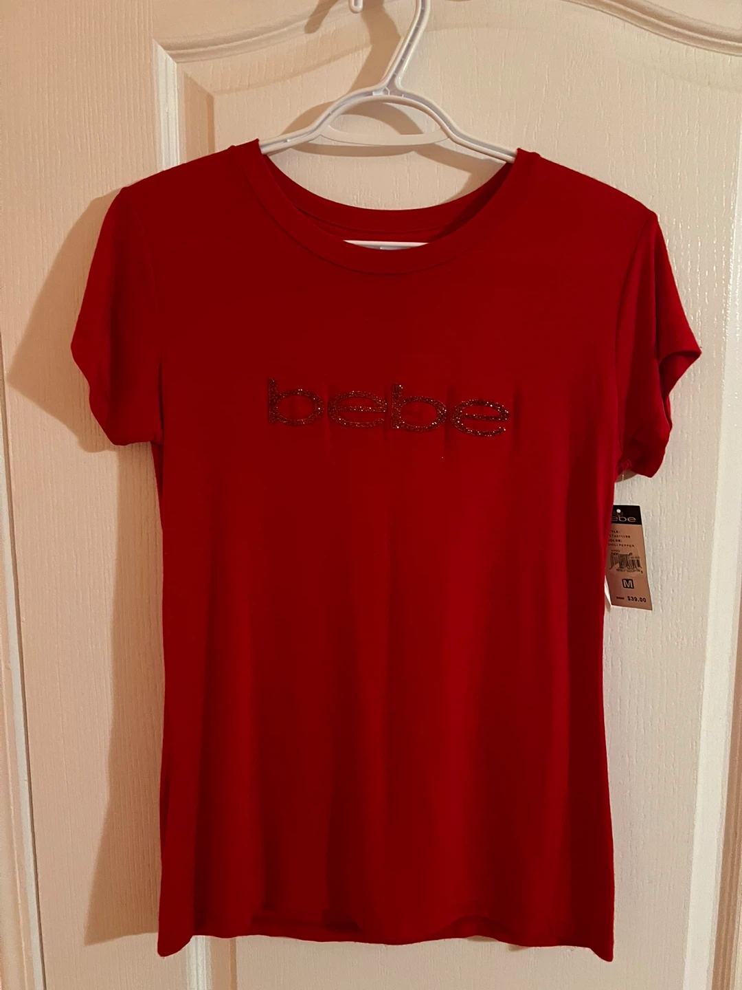 A classic red short-sleeve t-shirt from Bebe. It features the Bebe logo embellished with rhinestones across the chest. Made from a comfortable fabric.