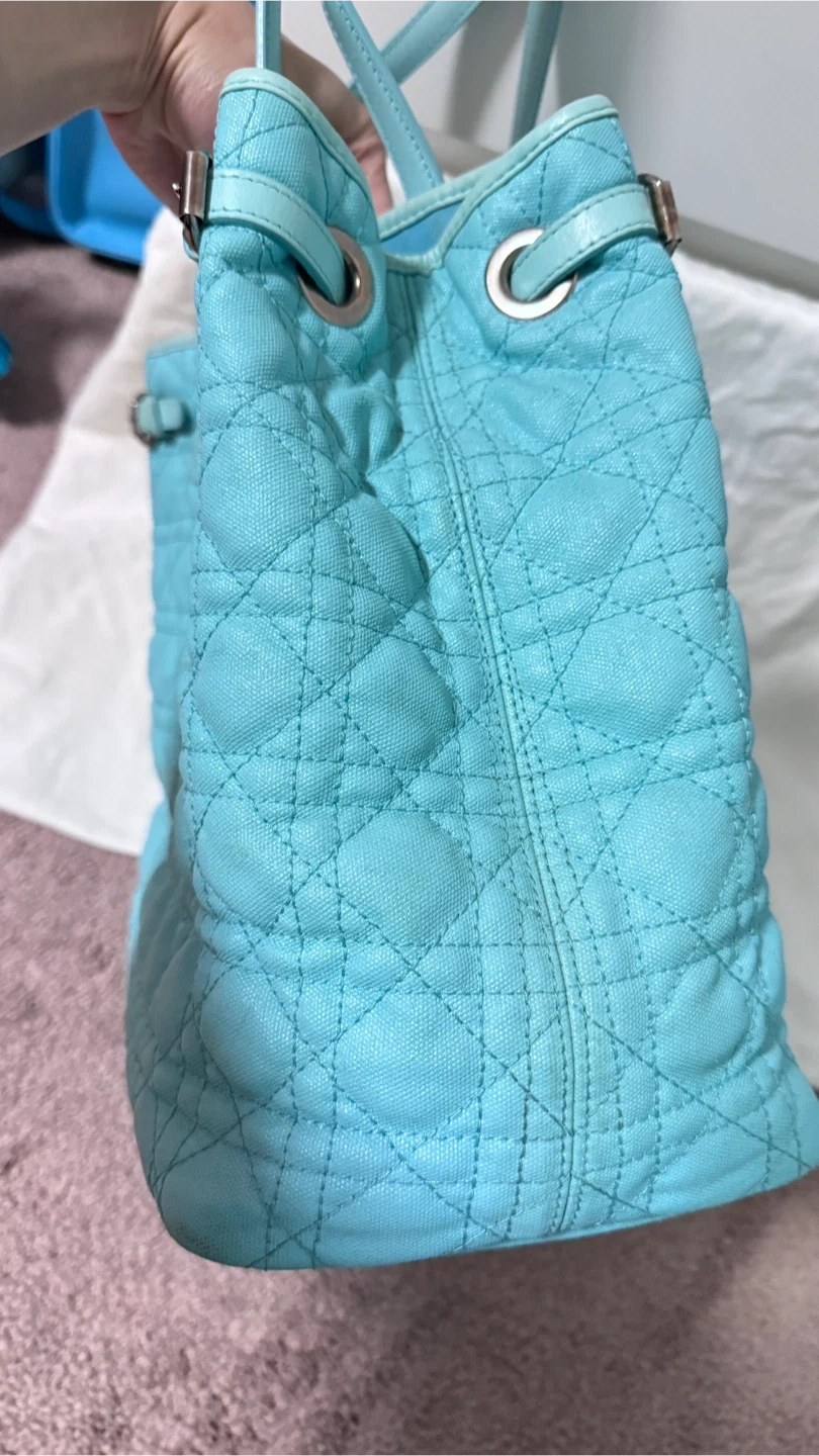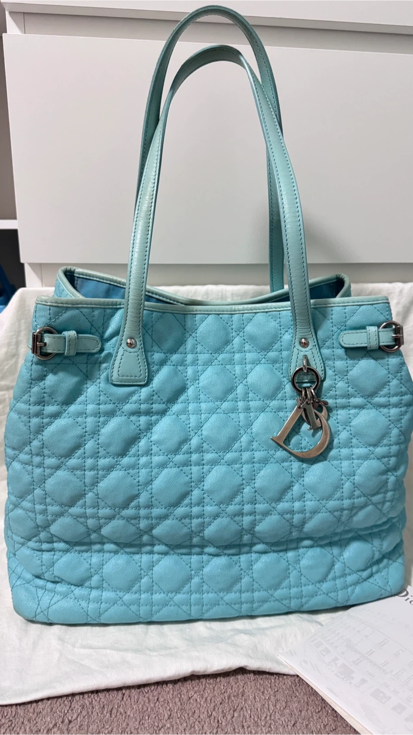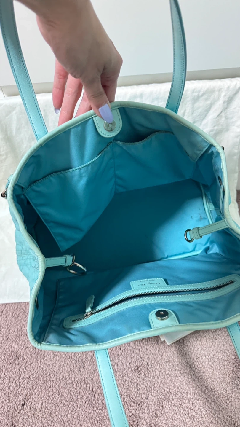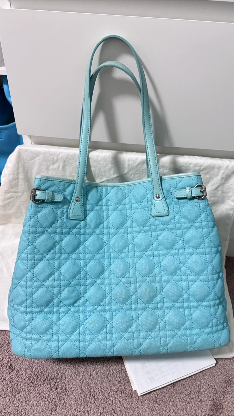 Gorgeous light blue Christian Dior Cannage tote bag. It's made in Italy with leather trim and handles. Interior has a zippered pocket.