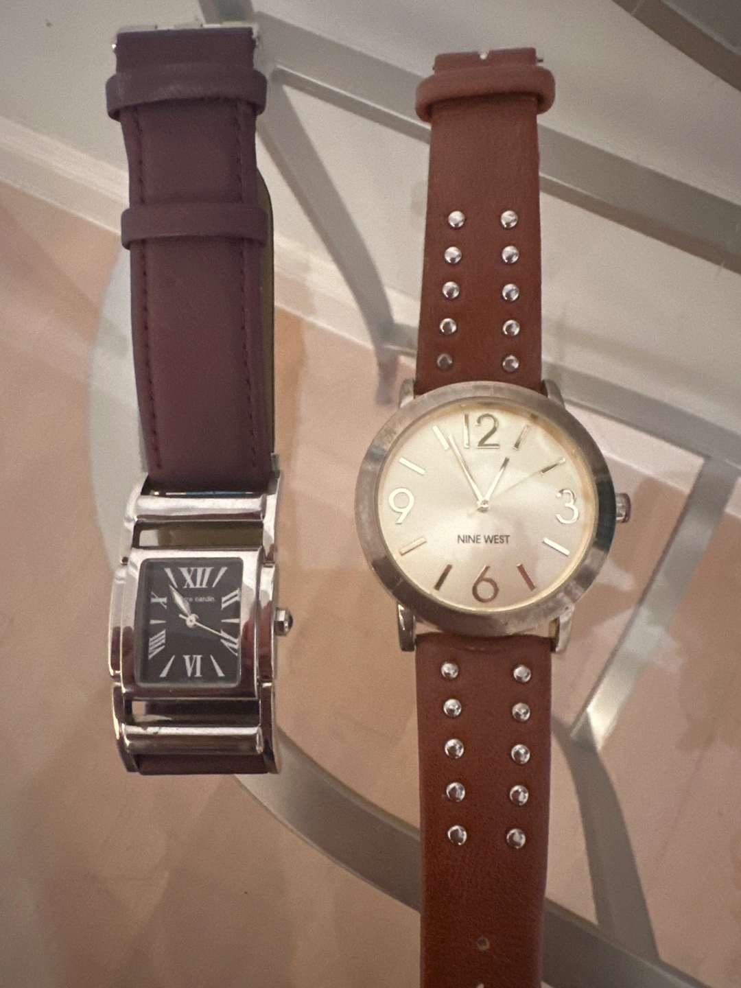 Two wrist watches, one with a brown leather band and the other with a silver band. One watch has a black face and the other has a white face. Both are in good condition.