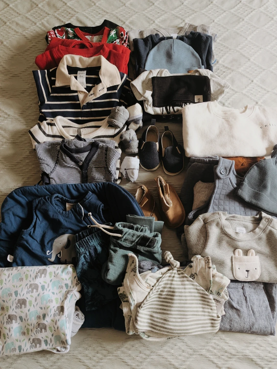 This lot contains a variety of baby clothing items including onesies, sweaters, pants, and hats. Most items appear to be for infants and toddlers. Please check individual items for specific sizing and material details. Great for building a baby's wardrobe!