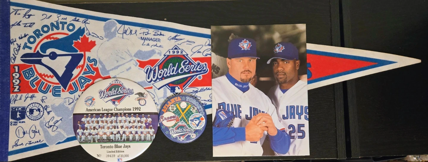 Im Selling a Collection of vintage Blue Jay Memorabilia that Includes 1992 World Series/American League Champions Pennant, 2 World Series Buttons, one is a 6" limited edition. Also includes a Rare 1997 Promotional Poster with Roger Clemens and Carlos Delgado. New Condition, Never Displayed, factory folded. All Memorabilia is in Excellent Vintage Condition. ASKING $35 FIRM.