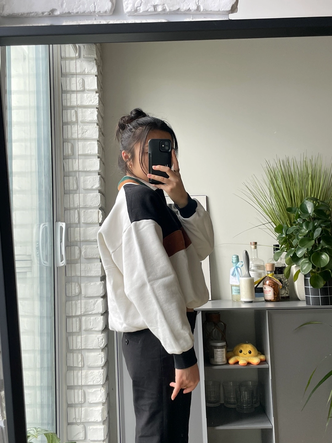 Colour: Mostly white white black and brown colour blocks