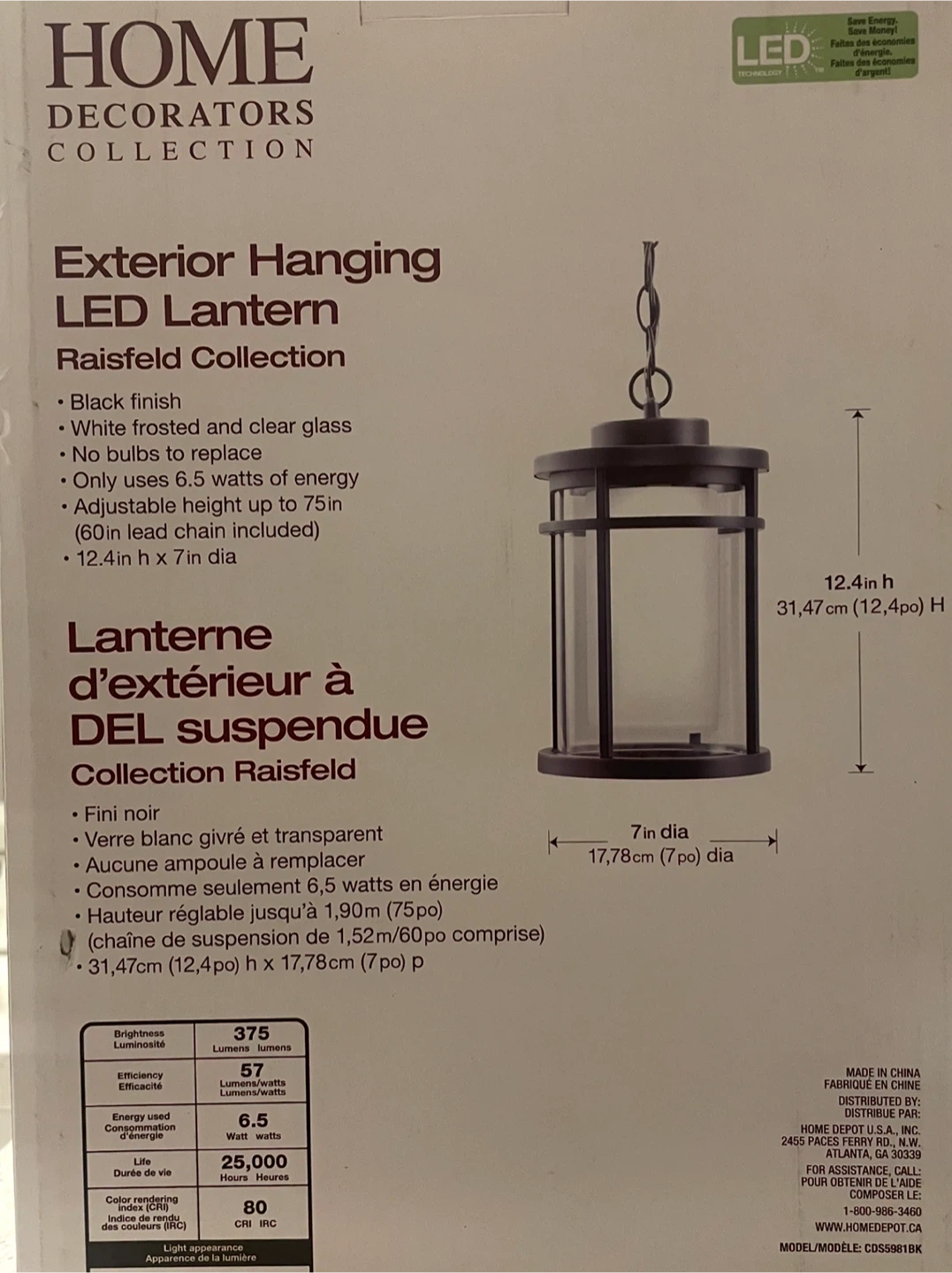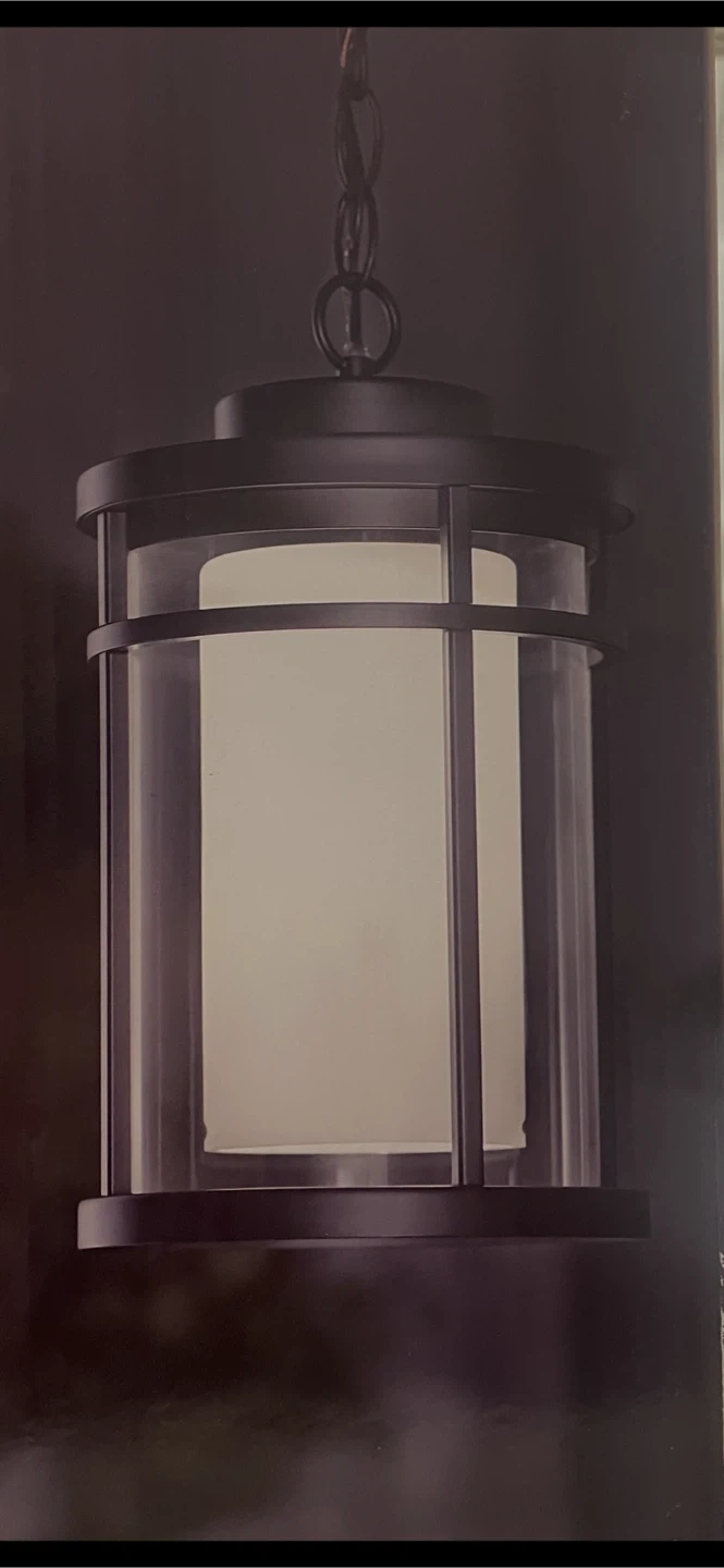 Selling a brand new LED Exterior Hanging Lantern, still in its original box! It features a sleek black finish with white frosted and clear glass. No need to replace any bulbs, as it only uses 6.5 watts of energy. Dimensions are 12.4 inches in height and 7 inches in diameter.I have 2 of those lanterns.