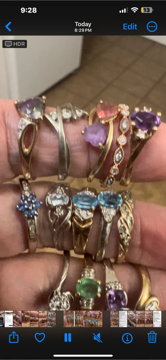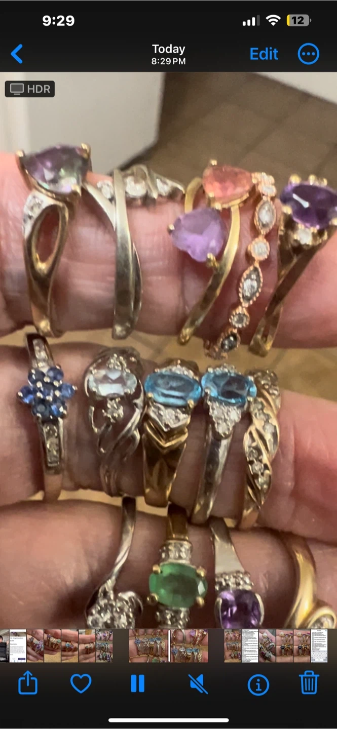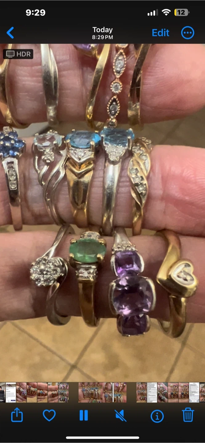 10k gold rings. Features mystic topaz, amethyst, pink tourmaline, sapphire, aquamarine, emerald, and diamond stones. Sizes range from 4.5 to 7.