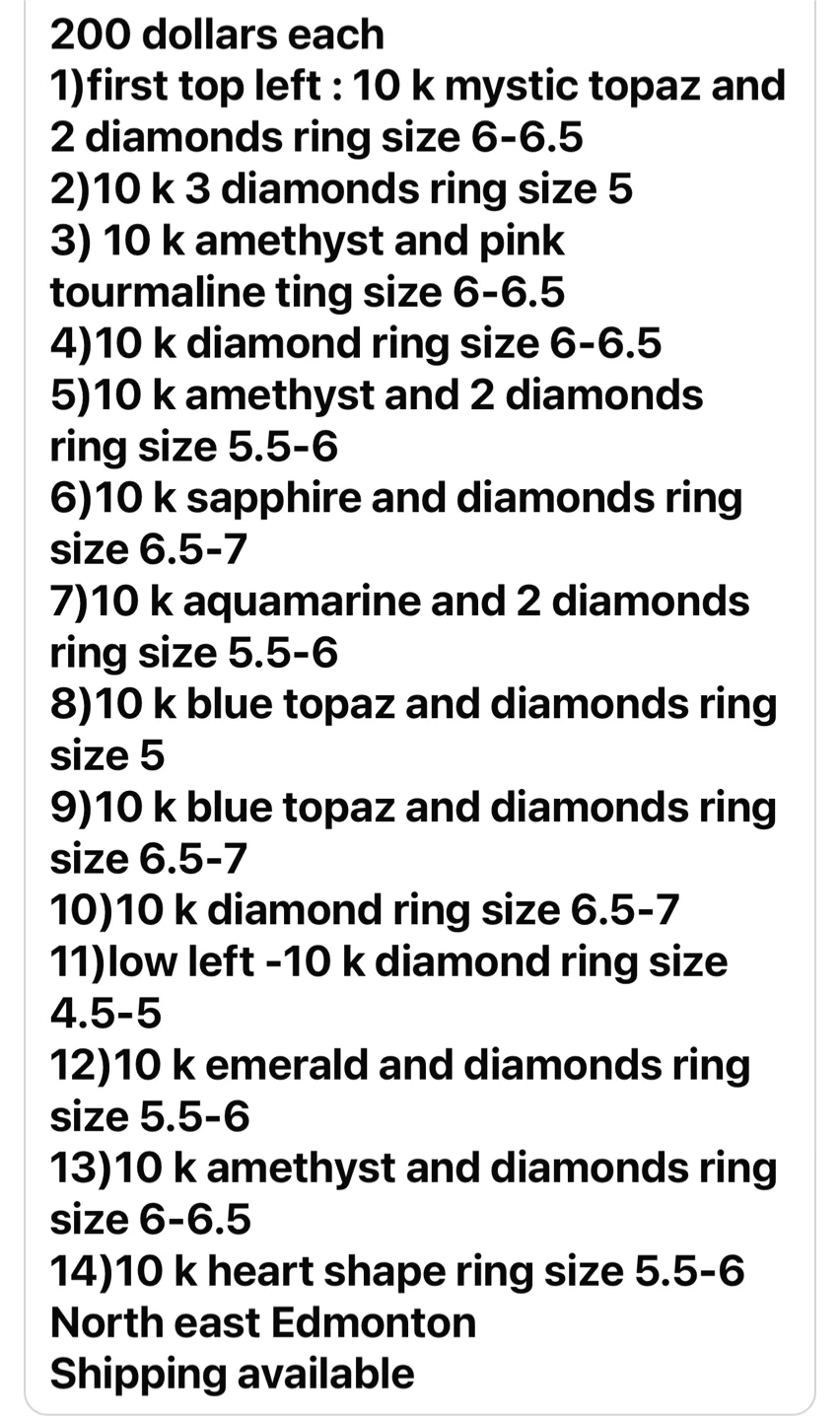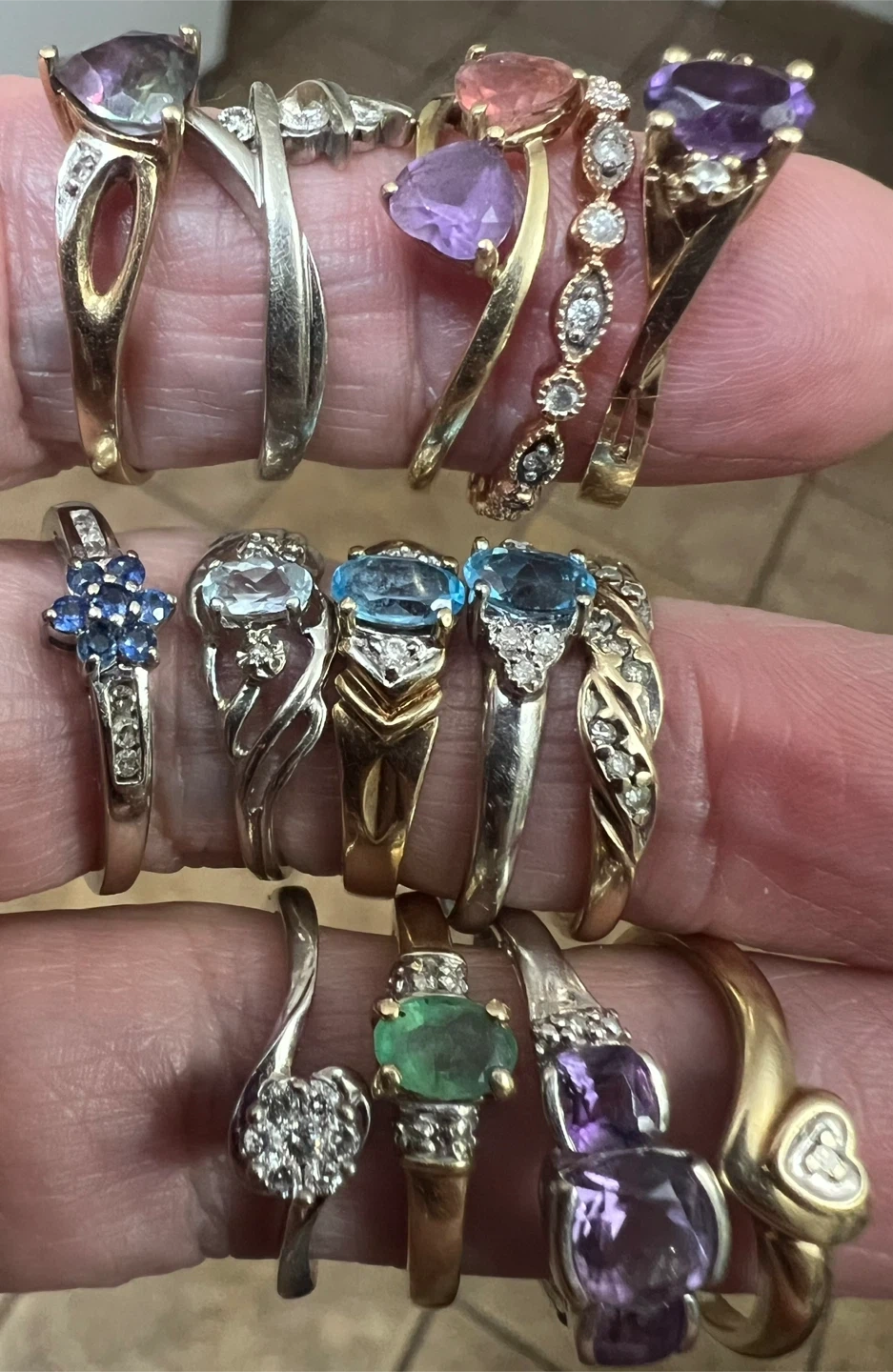 10k gold rings. Features mystic topaz, amethyst, pink tourmaline, sapphire, aquamarine, emerald, and diamond stones. Sizes range from 4.5 to 7.