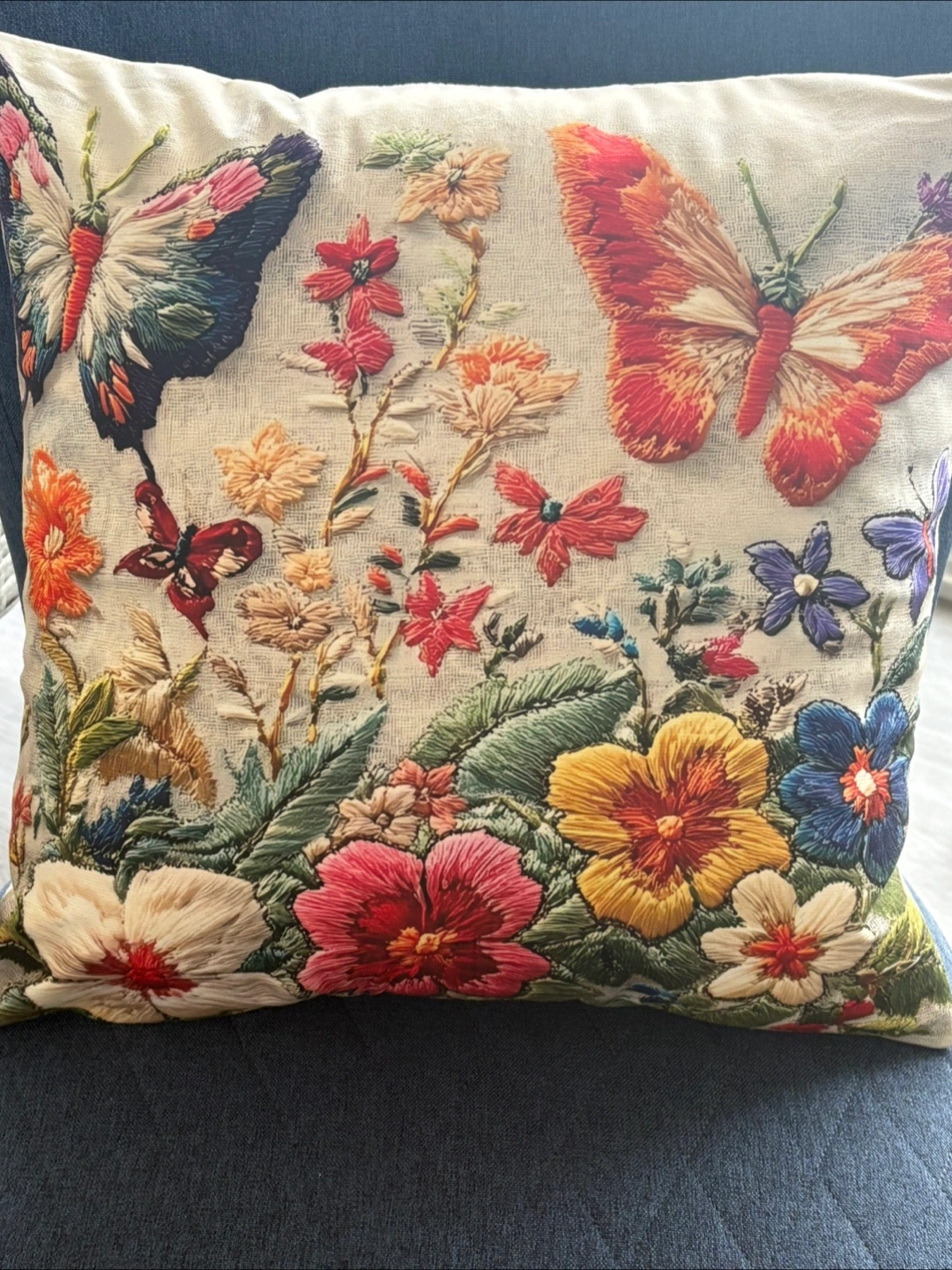 Add a touch of nature to your home with this beautiful pillow cover! It features a lovely embroidered printed design with colourful flowers and butterflies. Perfect for adding a cozy and decorative touch to your couch or bed