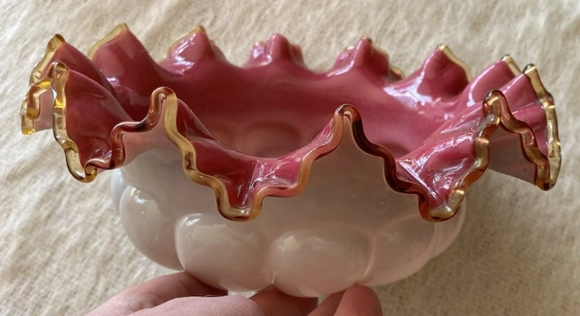 This is a stunning Fenton pink rose bowl with a ruffled edge and gold trim, perfect as a centrepiece or decorative accent. Being a vintage piece, it shows some signs of age, adding to its charm and character. Specifications: - Brand: Fenton - Colour: Pink with gold trim - Material: Glass - Style: Rose Bowl with Ruffled Edge