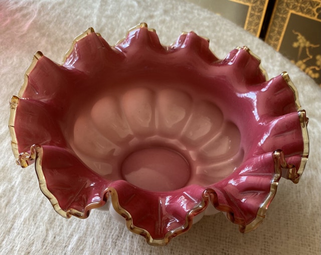This is a stunning Fenton pink rose bowl with a ruffled edge and gold trim, perfect as a centrepiece or decorative accent. Being a vintage piece, it shows some signs of age, adding to its charm and character. Specifications: - Brand: Fenton - Colour: Pink with gold trim - Material: Glass - Style: Rose Bowl with Ruffled Edge
