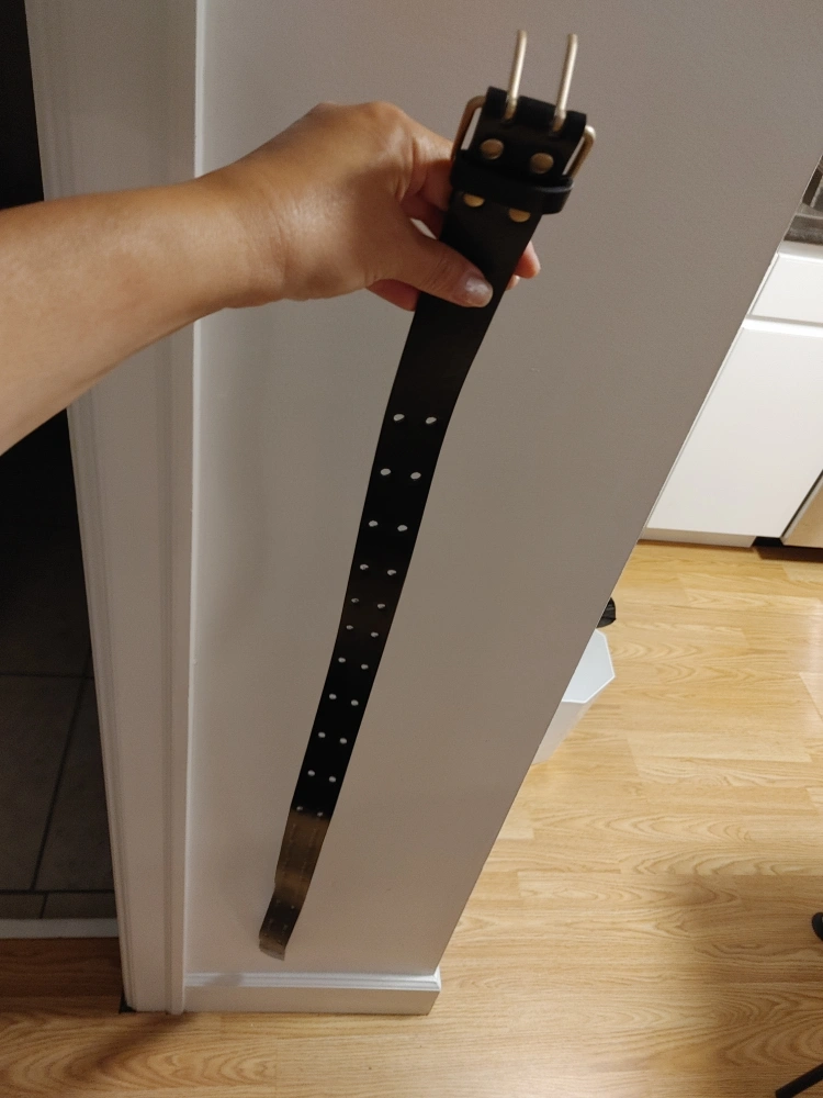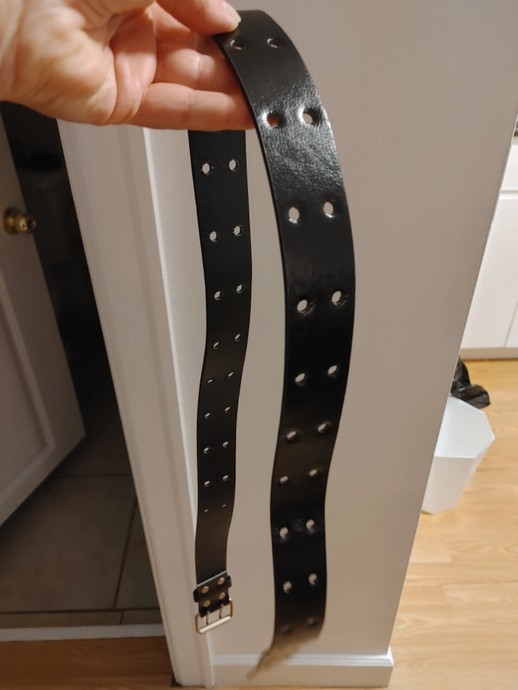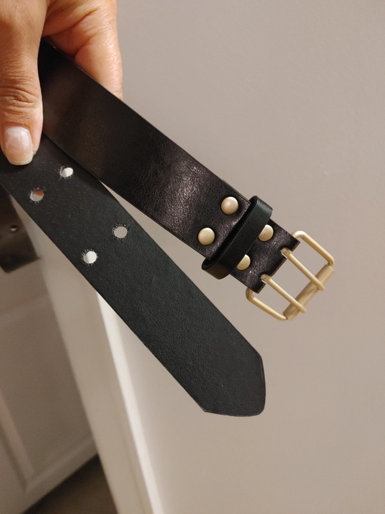 A classic black leather belt with a brass buckle. It features multiple holes for adjustable sizing. Leather material.