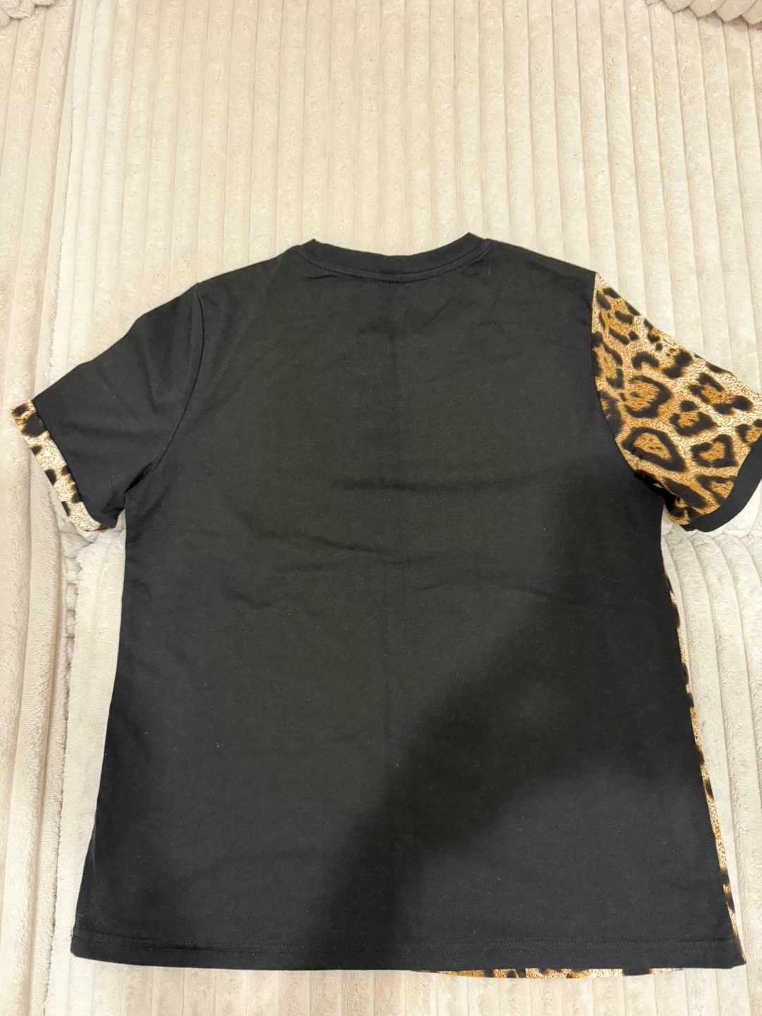 This SHEIN t-shirt features a unique colorblock design with a leopard print on the left side and sleeve, and solid black on the right. It's a short-sleeved crewneck style. A fun piece to add to your wardrobe!