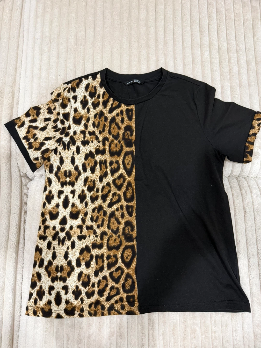 This SHEIN t-shirt features a unique colorblock design with a leopard print on the left side and sleeve, and solid black on the right. It's a short-sleeved crewneck style. A fun piece to add to your wardrobe!
