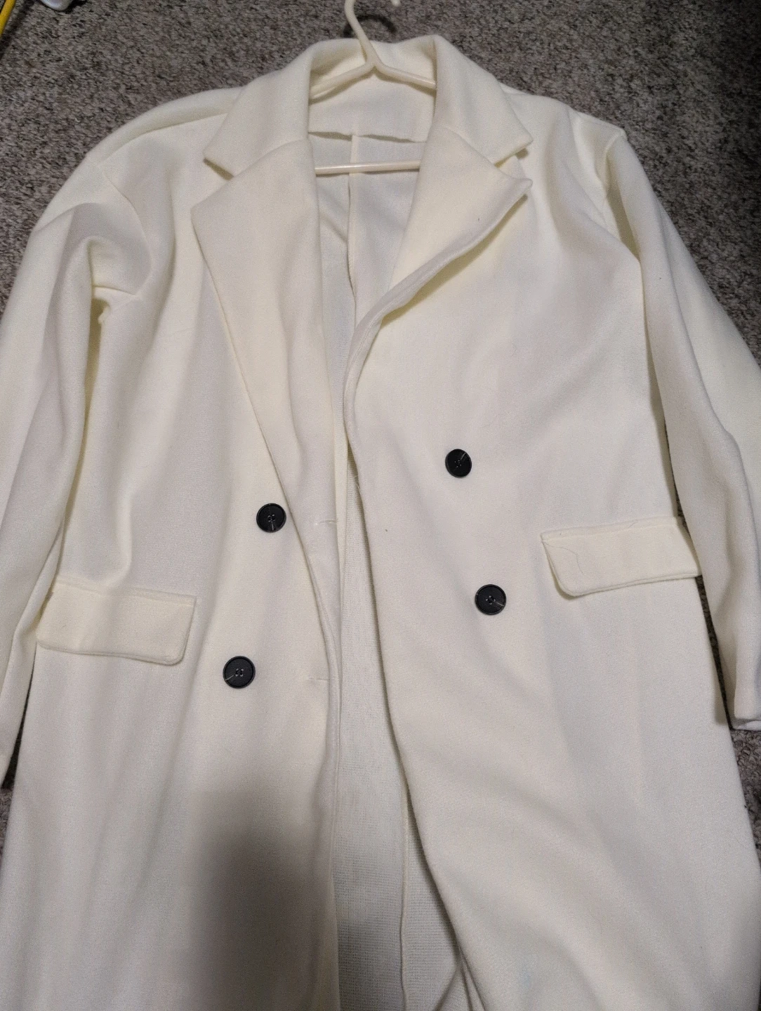 Cream coloured double-breasted long coat. Features two front pockets and button closure. A stylish outerwear piece. Lightweight women's 2-4XL