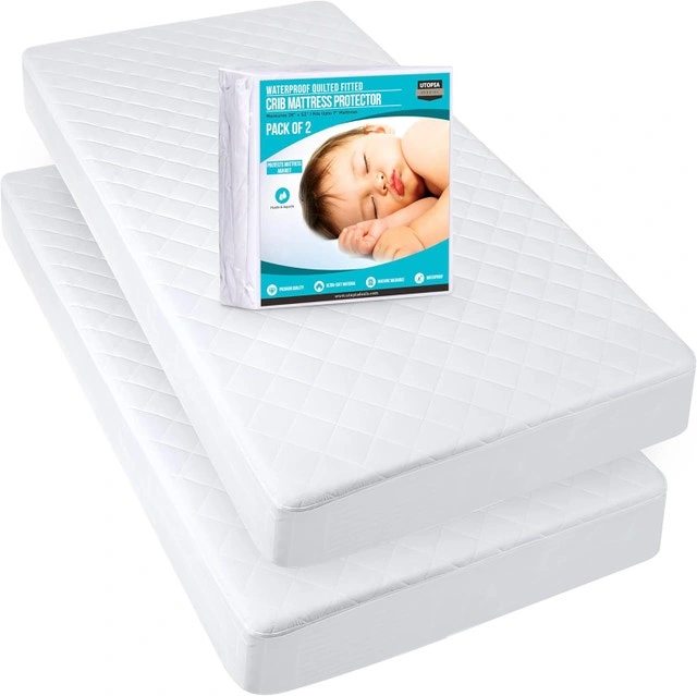 Utopia Bedding waterproof crib fitted mattress protectors, pack of 2. Fits standard size crib mattresses (28" x 52" x 7"). Features a soft, breathable quilted cloth top for comfort and protection from spills and stains. Easy care: Machine wash and tumble dry. Let me know if you're interested!