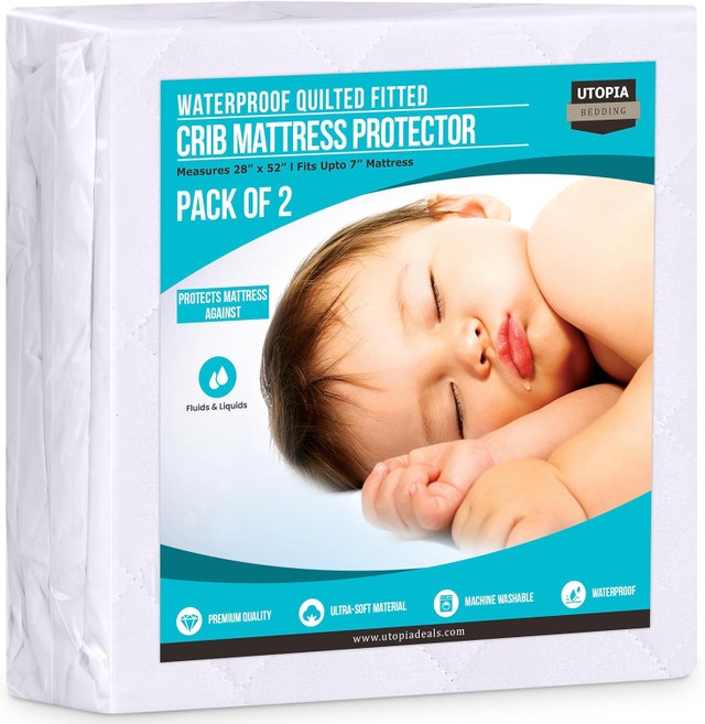Utopia Bedding waterproof crib fitted mattress protectors, pack of 2. Fits standard size crib mattresses (28" x 52" x 7"). Features a soft, breathable quilted cloth top for comfort and protection from spills and stains. Easy care: Machine wash and tumble dry. Let me know if you're interested!