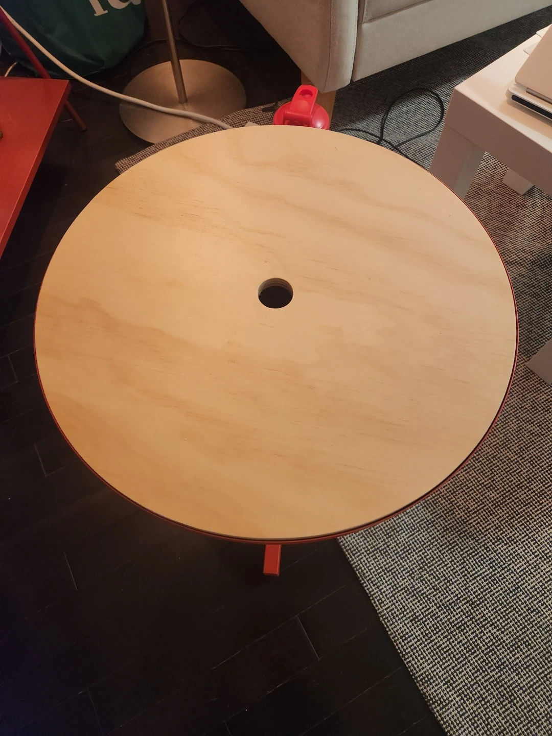 Red side table with a pine plywood top. It's in good condition and ready for a new home! Great for placing drinks or decor.