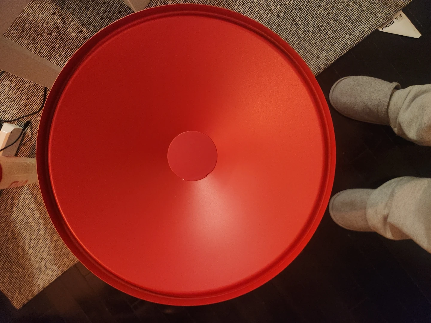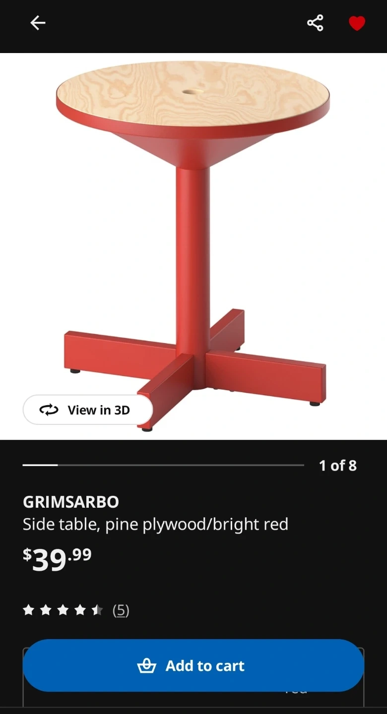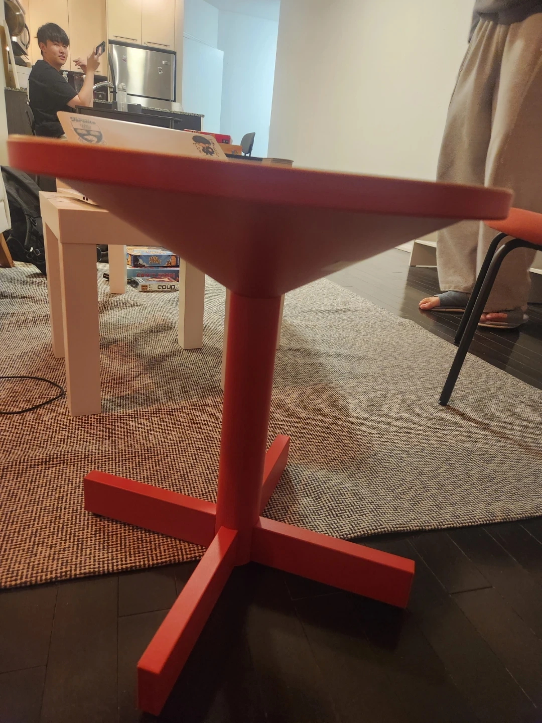 Red side table with a pine plywood top. It's in good condition and ready for a new home! Great for placing drinks or decor.