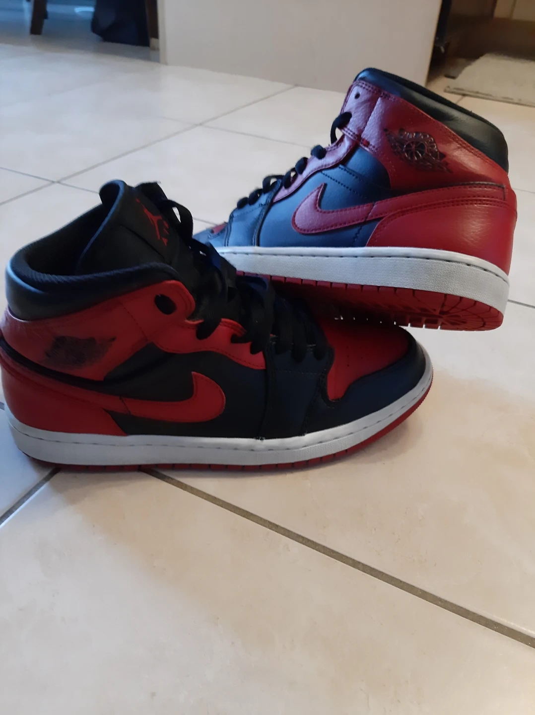 These are Air Jordan 1 Mid sneakers in a red and black colourway. Leather upper with a rubber sole. Lace-up closure. Size 8